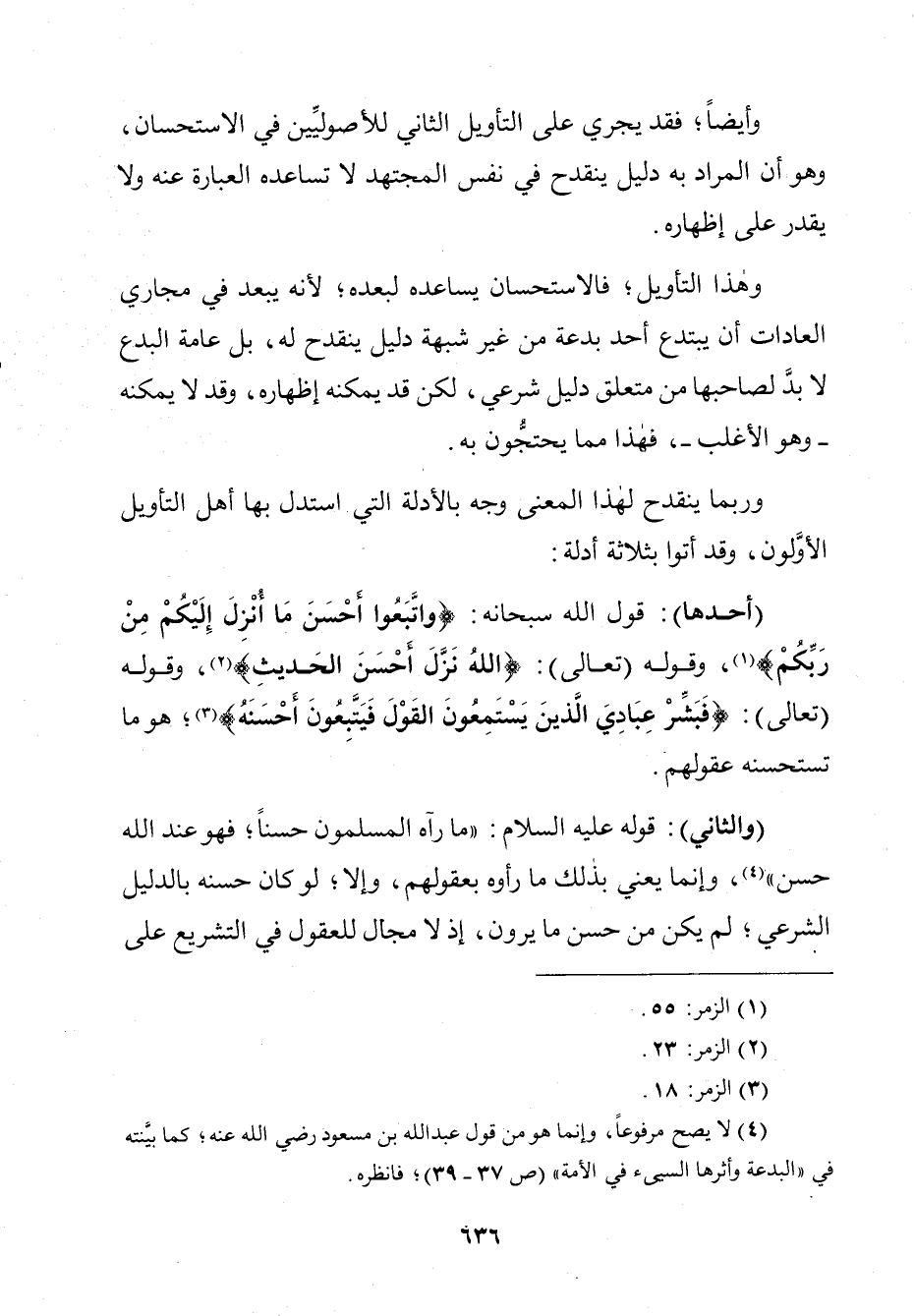 وَهَذَا التَّأْوِيلُ؛ فَالِاسْتِحْسَانُ يُسَاعِدُهُ لِبُعْدِهِ لِأَنَّهُ يَبْعُدُ فِي مَجَارِي الْعَادَاتِ أَنْ يَبْتَدِعَ أَحَدٌ بِدْعَةً مِنْ غَيْرِ شُبْهَةِ دَلِيلٍ يَنْقَدِحُ لَهُ. بَلْ عَامَّةُ الْبِدَعِ لَا بُدَّ لِصَاحِبِهَا مِنْ مُتَعَلِّقِ دَلِيلٍ شَرْعِيٍّ. لَكِنْ قَدْ يُمْكِنُهُ إِظْهَارُهُ وَقَدْ لَا يُمْكِنُهُ ـ وَهُوَ الْأَغْلَبُ ـ فَهَذَا مِمَّا يَحْتَجُّونَ بِهِ.