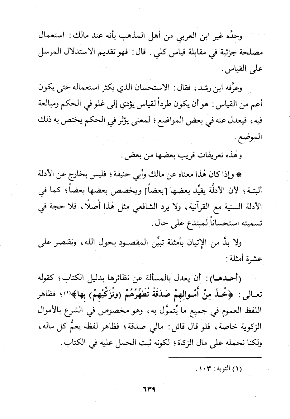 وَحَدَّهُ غَيْرُ ابْنُ الْعَرَبِيِّ مِنْ أَهْلِ الْمَذْهَبِ بِأَنَّهُ عِنْدَ مَالِكٍ: اسْتِعْمَالُ مَصْلَحَةٍ جُزْئِيَّةٍ فِي مُقَابَلَةِ قِيَاسٍ كُلِّيٍّ ـ قَالَ ـ فَهُوَ تَقْدِيمُ الِاسْتِدْلَالِ الْمُرْسَلِ عَلَى الْقِيَاسِ.