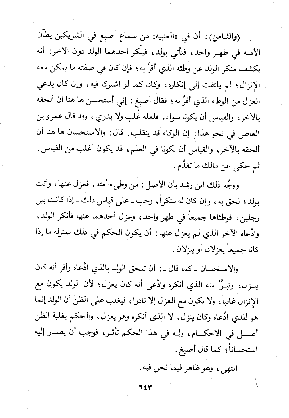 وَوَجَّهَ ذَلِكَ ابْنُ رُشْدٍ بِأَنَّ الْأَصْلَ: مَنْ وَطِئَ أَمَتَهُ فَعَزَلَ عَنْهَا وَأَتَتْ بِوَلَدٍ لَحِقَ بِهِ وَإِنْ كَانَ لَهُ مُنْكِرًا، وَجَبَ عَلَى قِيَاسِ ذَلِكَ إِذَا كَانَتْ بَيْنَ رَجُلَيْنِ فَوَطِئَاهَا جَمِيعًا فِي طُهْرٍ وَاحِدٍ وَعَزَلَ أَحَدُهُمَا عَنْهَا فَأَنْكَرَ الْوَلَدَ وَادَّعَاهُ الْآخَرُ الَّذِي لَمْ يَعْزِلْ عَنْهَا أَنْ يَكُونَ الْحُكْمُ فِي ذَلِكَ بِمَنْزِلَةِ مَا إِذَا كَانَا جَمِيعًا يَعْزِلَانِ أَوْ يُنْزِلَانِ.