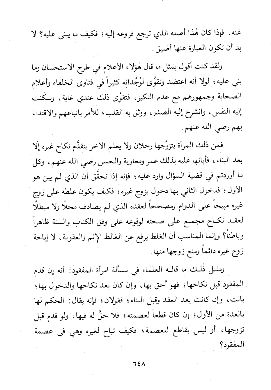 وَمِثْلُ ذَلِكَ مَا قَالَهُ الْعُلَمَاءُ فِي مَسْأَلَةِ امْرَأَةِ الْمَفْقُودِ: أَنَّهُ إِنْ قَدِمَ الْمَفْقُودُ قَبْلَ نِكَاحِهَا فَهُوَ أَحَقُّ بِهَا، وَإِنْ كَانَ بَعْدَ نِكَاحِهَا وَالدُّخُولِ بِهَا بَانَتْ، وَإِنْ كَانَ بَعْدَ الْعَقْدِ وَقَبْلَ الْبِنَاءِ فَقَوْلَانِ، فَإِنَّهُ يُقَالُ: الْحُكْمُ لَهَا بِالْعِدَّةِ مِنَ الْأَوَّلِ إِنْ كَانَ قَطْعًا لِعِصْمَتِهِ فَلَا حَقَّ لَهُ فِيهَا، وَلَوْ قَدِمَ قَبْلَ تَزَوُّجِهَا، أَوْ لَيْسَ بِقَاطِعٍ لِلْعِصْمَةِ، فَكَيْفَ تُبَاحُ لِغَيْرِهِ فِي عِصْمَةِ الْمَفْقُودِ؟