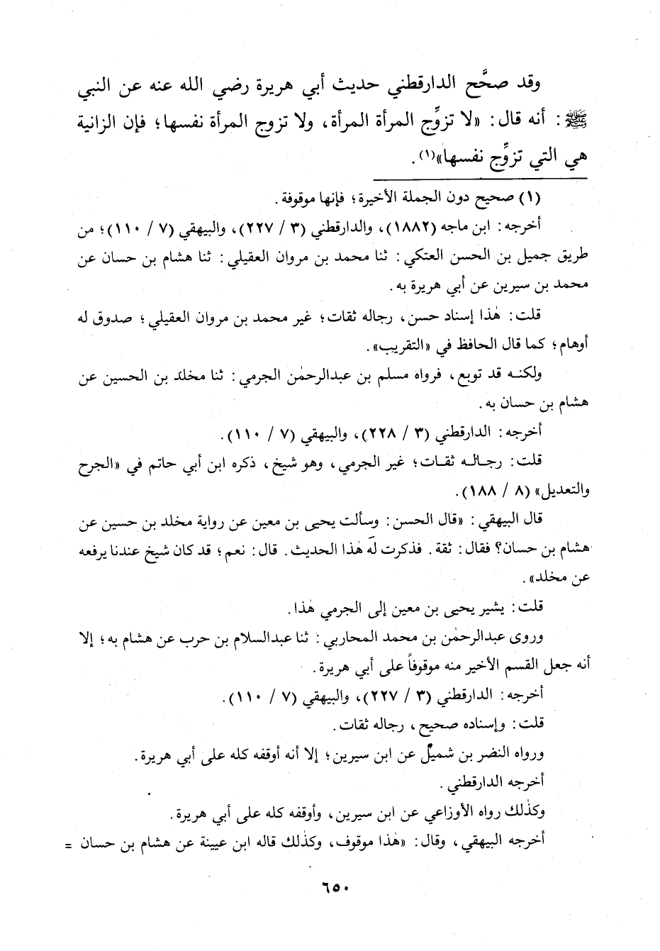 وَقَدْ صَحَّحَ الدَّارَقُطْنِيُّ حَدِيثَ أَبِي هُرَيْرَةَ ـ رَضِيَ اللَّهُ عَنْهُ ـ، عَنِ النَّبِيِّ صَلَّى اللَّهُ عَلَيْهِ وَسَلَّمَ أَنَّهُ قَالَ: «لَا تُزَوِّجُ الْمَرْأَةُ الْمَرْأَةَ وَلَا تُزَوِّجُ الْمَرْأَةُ نَفْسَهَا، فَإِنَّ الزَّانِيَةَ هِيَ الَّتِي تُزَوِّجُ نَفْسَهَا»