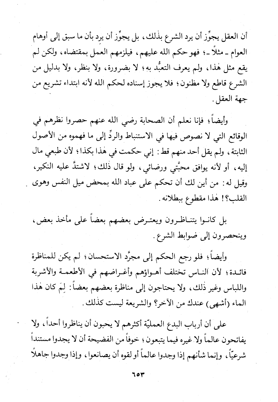 وَأَيْضًا؛ فَإِنَّا نَعْلَمُ أَنَّ الصَّحَابَةَ ـ رَضِيَ اللَّهُ عَنْهُمْ ـ حَصَرُوا نَظَرَهُمْ فِي الْوَقَائِعِ الَّتِي لَا نُصُوصَ فِيهَا فِي الِاسْتِنْبَاطِ وَالرَّدِّ إِلَى مَا فَهِمُوهُ مِنَ الْأُصُولِ الثَّابِتَةِ. وَلَمْ يَقُلْ أَحَدٌ مِنْهُمْ: إِنِّي حَكَمْتُ فِي هَذَا بِكَذَا لِأَنَّ طَبْعِي مَالَ إِلَيْهِ، أَوْ لِأَنَّهُ يُوَافِقُ مَحَبَّتِي وَرِضَائِي، وَلَوْ قَالَ ذَلِكَ لَاشْتَدَّ عَلَيْهِ النَّكِيرُ، وَقِيلَ لَهُ: مِنْ أَيْنَ لَكَ أَنْ تَحْكُمَ عَلَى عِبَادَةِ اللَّهِ بِمَحْضِ مَيْلِ النَّفْسِ وَهَوَى الْقَلْبِ؟ هَذَا مَقْطُوعٌ بِبُطْلَانِهِ.