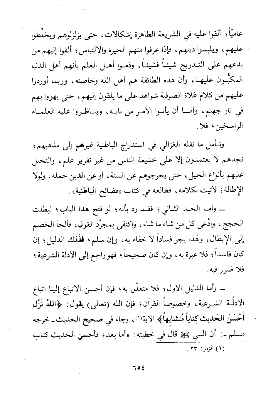 - وَأَمَّا الدَّلِيلُ الْأَوَّلُ، فَلَا مُتَعَلِّقَ بِهِ، فَإِنَّ أَحْسَنَ الِاتِّبَاعِ إِلَيْنَا اتِّبَاعُ الْأَدِلَّةِ الشَّرْعِيَّةِ، وَخُصُوصًا الْقُرْآنَ، فَإِنَّ اللَّهَ تَعَالَى يَقُولُ: {اللَّهُ نَزَّلَ أَحْسَنَ الْحَدِيثِ كِتَابًا مُتَشَابِهًا} [الزمر: 23] الْآيَةَ، وَجَاءَ فِي صَحِيحِ الْحَدِيثِ ـ خَرَّجَهُ مُسْلِمٌ ـ أَنَّ النَّبِيَّ صَلَّى اللَّهُ عَلَيْهِ وَسَلَّمَ «قَالَ فِي خُطْبَتِهِ: أَمَّا بَعْدُ، فَأَحْسَنُ الْحَدِيثِ كِتَابُ اللَّهِ»