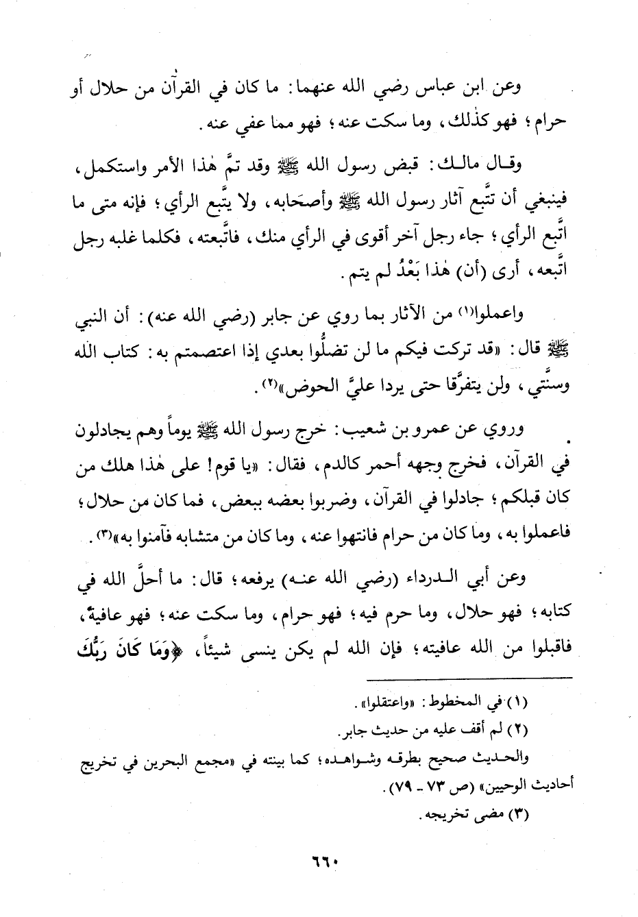 وَاعْمَلُوا مِنَ الْآثَارِ بِمَا رُوِيَ عَنْ جَابِرٍ ـ رَضِيَ اللَّهُ عَنْهُ ـ. أَنَّ النَّبِيَّ صَلَّى اللَّهُ عَلَيْهِ وَسَلَّمَ قَالَ: «قَدْ تَرَكْتُ فِيكُمْ مَا لَنْ تَضِلُّوا بَعْدِي إِذَا اعْتَصَمْتُمْ بِهِ: كِتَابَ اللَّهِ وَسُنَّتِي وَلَنْ يَتَفَرَّقَا حَتَّى يَرِدَا عَلَى الْحَوْضِ».