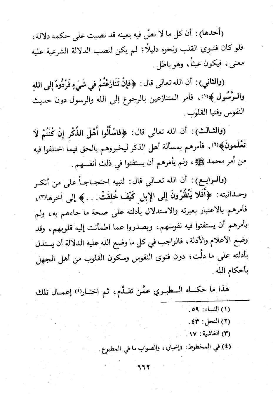 وَالرَّابِعُ: أَنَّ اللَّهَ تَعَالَى قَالَ لِنَبِيِّهِ احْتِجَاجًا عَلَى مَنْ أَنْكَرَ وَحْدَانِيَّتَهُ: {أَفَلَا يَنْظُرُونَ إِلَى الْإِبِلِ كَيْفَ خُلِقَتْ} [الغاشية: 17]. إِلَى آخِرِهَا. فَأَمَرَهُمْ بِالِاعْتِبَارِ بِعِبْرَتِهِ، وَالِاسْتِدْلَالِ بِأَدِلَّتِهِ عَلَى صِحَّةِ مَا جَاءَهُمْ بِهِ، وَلَمْ يَأْمُرْهُمْ أَنْ يَسْتَفْتُوا فِيهِ نُفُوسَهُمْ، وَيَصُدُّوا عَمَّا اطْمَأَنَّتْ إِلَيْهِ قُلُوبُهُمْ، وَقَدْ وَضَعَ الْأَعْلَامَ وَالْأَدِلَّةَ، فَالْوَاجِبُ فِي كُلِّ مَا وَضَعَ اللَّهُ عَلَيْهِ الدَّلَالَةَ أَنْ يُسْتَدَلَّ بِأَدِلَّتِهِ عَلَى مَا دَلَّتْ، دُونَ فَتْوَى النُّفُوسِ وَسُكُونِ الْقُلُوبِ مِنْ أَهْلِ الْجَهْلِ بِأَحْكَامِ اللَّهِ.