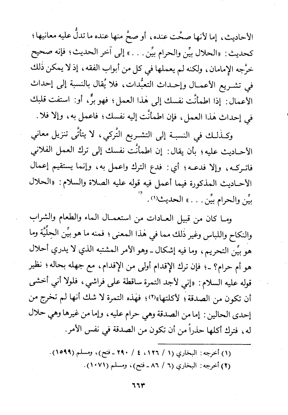 «الْحَلَالُ بَيِّنٌ وَالْحَرَامُ بَيِّنٌ» إِلَى آخِرِ الْحَدِيثِ، فَإِنَّهُ صَحِيحٌ خَرَّجَهُ الْإِمَامَانِ. وَلَكِنَّهُ لَمْ يَعْمَلْهَا فِي كُلٍّ مِنْ أَبْوَابِ الْفِقْهِ، إِذْ لَا يُمْكِنُ ذَلِكَ فِي تَشْرِيعِ الْأَعْمَالِ وَإِحْدَاثِ التَّعَبُّدَاتِ، فَلَا يُقَالُ بِالنِّسْبَةِ إِلَى إِحْدَاثِ الْأَعْمَالِ: إِذَا اطْمَأَنَّتْ نَفْسُكَ إِلَى هَذَا الْعَمَلِ فَهُوَ بِرٌّ، أَوِ: اسْتَفْتِ قَلْبِكَ فِي إِحْدَاثِ هَذَا الْعَمَلِ، فَإِنِ اطْمَأَنَّتْ إِلَيْهِ نَفْسُكَ فَاعْمَلْ بِهِ وَإِلَّا فَلَا.