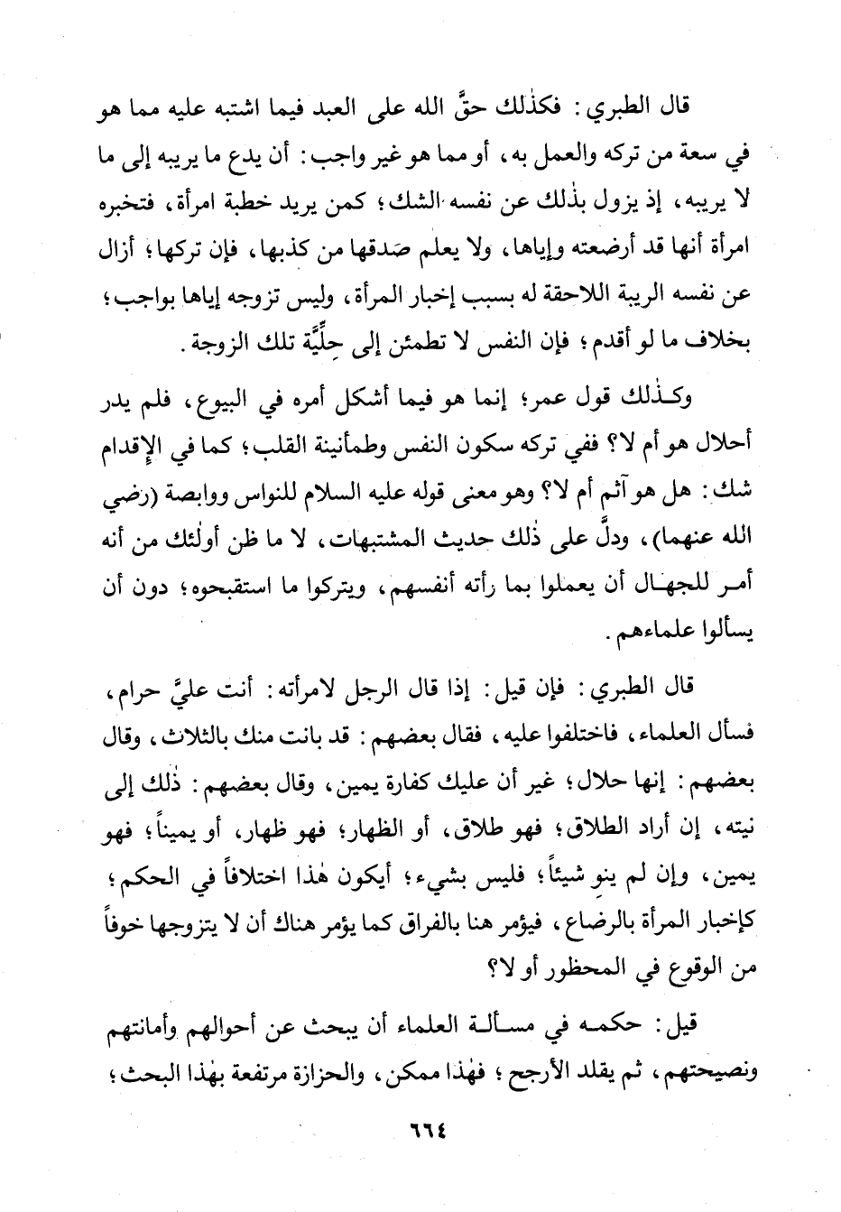 قَالَ الطَّبَرِيُّ، فَإِنْ قِيلَ: إِذَا قَالَ الرَّجُلُ لِامْرَأَتِهِ: أَنْتَ عَلِيَّ حَرَامٌ. فَسَأَلَ الْعُلَمَاءَ فَاخْتَلَفُوا عَلَيْهِ. فَقَالَ بَعْضُهُمْ: قَدْ بَانَتْ مِنْكَ بِالثَّلَاثِ: وَقَالَ بَعْضُهُمْ: إِنَّهَا حَلَالٌ غَيْرَ أَنَّ عَلَيْكَ كَفَّارَةَ يَمِينٍ. وَقَالَ بَعْضُهُمْ: ذَلِكَ إِلَى نِيَّتِهِ إِنْ أَرَادَ الطَّلَاقَ فَهُوَ طَلَاقٌ. أَوِ الظِّهَارَ فَهُوَ ظِهَارٌ. أَوْ يَمِينًا فَهُوَ يَمِينٌ. وَإِنْ لَمْ يَنْوِ شَيْئًا فَلَيْسَ بِشَيْءٍ: أَيَكُونُ هَذَا اخْتِلَافًا فِي الْحُكْمِ كَإِخْبَارِ الْمَرْأَةِ بِالرِّضَاعِ فَيُؤْمَرُ هُنَا بِالْفِرَاقِ، كَمَا يُؤْمَرُ هُنَاكَ أَنْ لَا يَتَزَوَّجَهَا خَوْفًا مِنَ الْوُقُوعِ فِي الْمَحْظُورِ أَوْ لَا؟ قِيلَ: حُكْمُهُ فِي مَسْأَلَةِ الْعُلَمَاءِ أَنْ يَبْحَثَ عَنْ أَحْوَالِهِمْ وَأَمَانَتِهِمْ وَنَصِيحَتِهِمْ ثُمَّ يُقَلِّدُ الْأَرْجَحَ. فَهَذَا مُمْكِنٌ، وَالْحَزَّازَةُ مُرْتَفِعَةٌ بِهَذَا الْبَحْثِ.