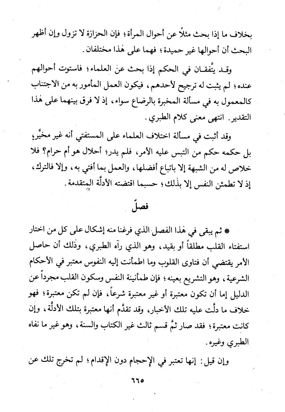 ثُمَّ يَبْقَى فِي هَذَا الْفَصْلِ الَّذِي فَرَغْنَا مِنْهُ إِشْكَالٌ عَلَى كُلِّ مَنِ اخْتَارَ اسْتِفْتَاءَ الْقَلْبِ مُطْلَقًا أَوْ بِقَيْدٍ، وَهُوَ الَّذِي رَآهُ الطَّبَرِيُّ. وَذَكِّ أَنَّ حَاصِلَ الْأَمْرِ يَقْتَضِي أَنَّ فَتَاوَى الْقُلُوبِ وَمَا اطْمَأَنَّتْ إِلَيْهِ النُّفُوسُ مُعْتَبَرٌ فِي الْأَحْكَامِ الشَّرْعِيَّةِ، وَهُوَ التَّشْرِيعُ بِعَيْنِهِ، فَإِنَّ طُمَأْنِينَةَ النَّفْسِ الْقَلْبُ مُجَرَّدًا عَنِ الدَّلِيلِ، إِمَّا أَنْ تَكُونَ مُعْتَبَرَةً أَوْ غَيْرَ مُعْتَبَرَةٍ شَرْعًا، فَإِنْ لَمْ تَكُنْ مُعْتَبَرَةً فَهُوَ خِلَافُ مَا دَلَّتْ عَلَيْهِ تِلْكَ الْأَخْبَارُ، وَقَدْ تَقَدَّمَ أَنَّهَا مُعْتَبَرَةٌ بِتِلْكَ الْأَدِلَّةِ وَإِنْ كَانَتْ مُعْتَبَرَةً فَقَدْ صَارَ ثَمَّ قِسْمٌ ثَالِثٌ غَيْرَ الْكِتَابِ وَالسُّنَّةِ، وَهُوَ غَيْرُ مَا نَفَاهُ الطَّبَرِيُّ وَغَيْرُهُ.