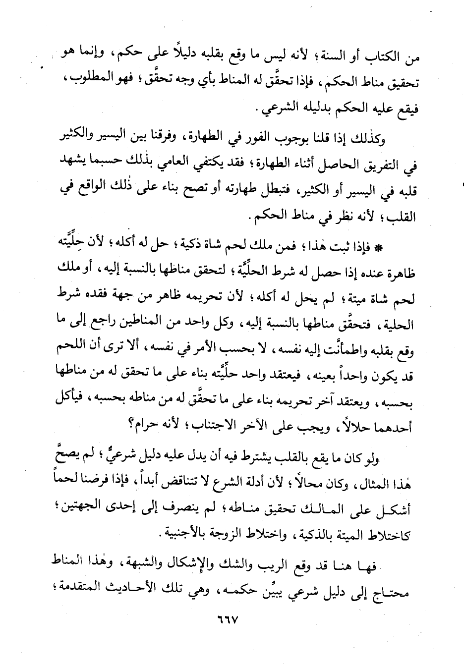 فَإِذَا ثَبَتَ هَذَا فَمَنْ مَلَكَ لَحْمَ شَاةٍ ذَكِيَّةٍ حَلَّ لَهُ أَكْلُهُ، لِأَنَّ حِلِّيَّتَهُ ظَاهِرَةٌ عِنْدَهُ إِذَا حَصَلَ لَهُ شَرْطُ الْحِلِّيَّةِ لِتَحْقِيقِ مَنَاطِهَا بِالنِّسْبَةِ إِلَيْهِ: أَوْ مَلَكَ لَحْمَ شَاةٍ مَيِّتَةٍ لَمْ يَحِلَّ لَهُ أَكْلُهُ، لِأَنَّ تَحْرِيمَهُ ظَاهِرٌ مِنْ جِهَةِ فَقْدِهِ شَرْطَ الْحِلِّيَّةِ، فَتَحَقَّقَ مَنَاطُهَا بِالنِّسْبَةِ إِلَيْهِ. وَكُلُّ وَاحِدٍ مِنَ الْمَنَاطَيْنِ رَاجِعٌ إِلَى مَا وَقَعَ بِقَلْبِهِ، وَاطْمَأَنَّتْ إِلَيْهِ نَفْسُهُ، لَا بِحَسَبِ الْأَمْرِ فِي نَفْسِهِ. أَلَا تَرَى أَنَّ اللَّحْمَ قَدْ يَكُونُ وَاحِدًا بِعَيْنِهِ فَيَعْتَقِدُ وَاحِدٌ حِلِّيَّتَهُ بِنَاءً عَلَى مَا تَحَقَّقَ لَهُ مِنْ مَنَاطِهِ بِحَسَبِهِ، وَيَعْتَقِدُ آخَرُ تَحْرِيمَهُ بِنَاءً عَلَى مَا تَحَقَّقَ لَهُ مِنْ مَنَاطِهِ بِحَسَبِهِ، فَيَأْكُلُ أَحَدُهُمَا حَلَالًا وَيَجِبُ عَلَى الْآخَرِ الِاجْتِنَابُ، لِأَنَّهُ حَرَامٌ؟ وَلَوْ كَانَ مَا يَقَعُ بِالْقَلْبِ يُشْتَرَطُ فِيهِ أَنْ يَدُلَّ عَلَيْهِ دَلِيلٌ شَرْعِيٌّ لَمْ يَصِحَّ هَذَا الْمِثَالُ وَكَانَ مُحَالًا، لِأَنَّ أَدِلَّةَ الشَّرْعِ لَا تَتَنَاقَضُ أَبَدًا. فَإِذَا فَرَضْنَا لَحْمًا أَشْكَلَ عَلَى الْمَالِكِ تَحْقِيقُ مَنَاطِهِ لَمْ يَنْصَرِفْ إِلَى إِحْدَى الْجِهَتَيْنِ، كَاخْتِلَاطِ الْمَيِّتَةِ بِالذَّكِيَّةِ، وَاخْتِلَاطِ الزَّوْجَةِ بِالْأَجْنَبِيَّةِ.