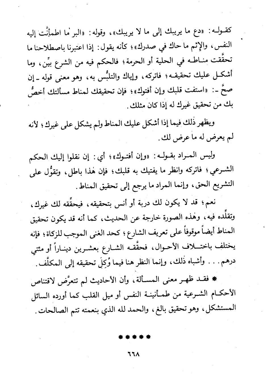 «دَعْ مَا يَرِيبُكَ إِلَى مَا لَا يَرِيبُكَ» وَقَوْلُهُ: «الْبِرُّ مَا اطْمَأَنَّتْ إِلَيْهِ النَّفْسُ، وَالْإِثْمُ مَا حَاكَ فِي صَدْرِكَ» كَأَنَّهُ يَقُولُ: إِذَا اعْتَبَرْنَا بِاصْطِلَاحِنَا مَا تَحَقَّقْتَ مَنَاطَهُ فِي الْحِلِّيَّةِ أَوِ الْحُرْمَةِ، فَالْحُكْمُ فِيهِ مِنَ الشَّرْعِ بَيِّنٌ.