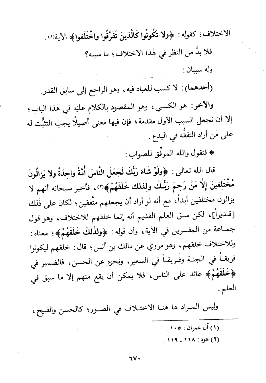 (أَحَدُهُمَا): لَا كَسْبَ لِلْعِبَادَةِ فِيهِ، وَهُوَ الرَّاجِعُ إِلَى سَابِقِ الْقَدَرِ، وَالْآخَرُ هُوَ الْكَسْبِيُّ وَهُوَ الْمَقْصُودُ بِالْكَلَامِ عَلَيْهِ فِي هَذَا الْبَابِ، إِلَّا أَنْ نَجْعَلَ السَّبَبَ الْأَوَّلَ مُقَدِّمَةً، فَإِنَّ فِيهَا مَعْنًى أَصِيلًا يَجِبُ التَّثَبُّتُ لَهُ عَلَى مَنْ أَرَادَ التَّفَقُّهَ فِي الْبِدَعِ. فَنَقُولُ وَاللَّهُ الْمُوَفِّقُ لِلصَّوَابِ: قَالَ اللَّهُ تَعَالَى: {وَلَوْ شَاءَ رَبُّكَ لَجَعَلَ النَّاسَ أُمَّةً وَاحِدَةً وَلَا يَزَالُونَ مُخْتَلِفِينَ إِلَّا مَنْ رَحِمَ رَبُّكَ وَلِذَلِكَ خَلَقَهُمْ} [هود: 118] فَأَخْبَرَ سُبْحَانَهُ أَنَّهُمْ لَا يَزَالُونَ مُخْتَلِفِينَ أَبَدًا، مَعَ أَنَّهُ لَوْ أَرَادَ أَنْ يَجْعَلَهُمْ مُتَّفِقِينَ لَكَانَ عَلَى ذَلِكَ قَدِيرًا لَكِنْ سَبَقَ الْعِلْمُ الْقَدِيمُ أَنَّهُ إِنَّمَا خَلَقَهُمْ لِلِاخْتِلَافِ، وَهُوَ قَوْلُ جَمَاعَةٍ مِنَ الْمُفَسِّرِينَ فِي الْآيَةِ، وَأَنَّ قَوْلَهُ: {وَلِذَلِكَ خَلَقَهُمْ} [هود: 119] مَعْنَاهُ: وَلِلِاخْتِلَافِ خَلَقَهُمْ. وَهُوَ مَرْوِيٌّ عَنْ مَالِكِ بْنِ أَنَسٍ قَالَ: خَلَقَهُمْ لِيَكُونُوا فَرِيقًا فِي الْجَنَّةِ وَفَرِيقًا فِي السَّعِيرِ. وَنَحْوَهُ عَنِ الْحَسَنِ فَالضَّمِيرُ فِي خَلَقَهُمْ عَائِدٌ عَلَى النَّاسِ، فَلَا يُمْكِنُ أَنْ يَقَعَ مِنْهُمْ إِلَّا مَا سَبَقَ فِي الْعِلْمِ، وَلَيْسَ الْمُرَادُ هَاهُنَا الِاخْتِلَافُ فِي الصُّوَرِ كَالْحَسَنِ وَالْقَبِيحِ