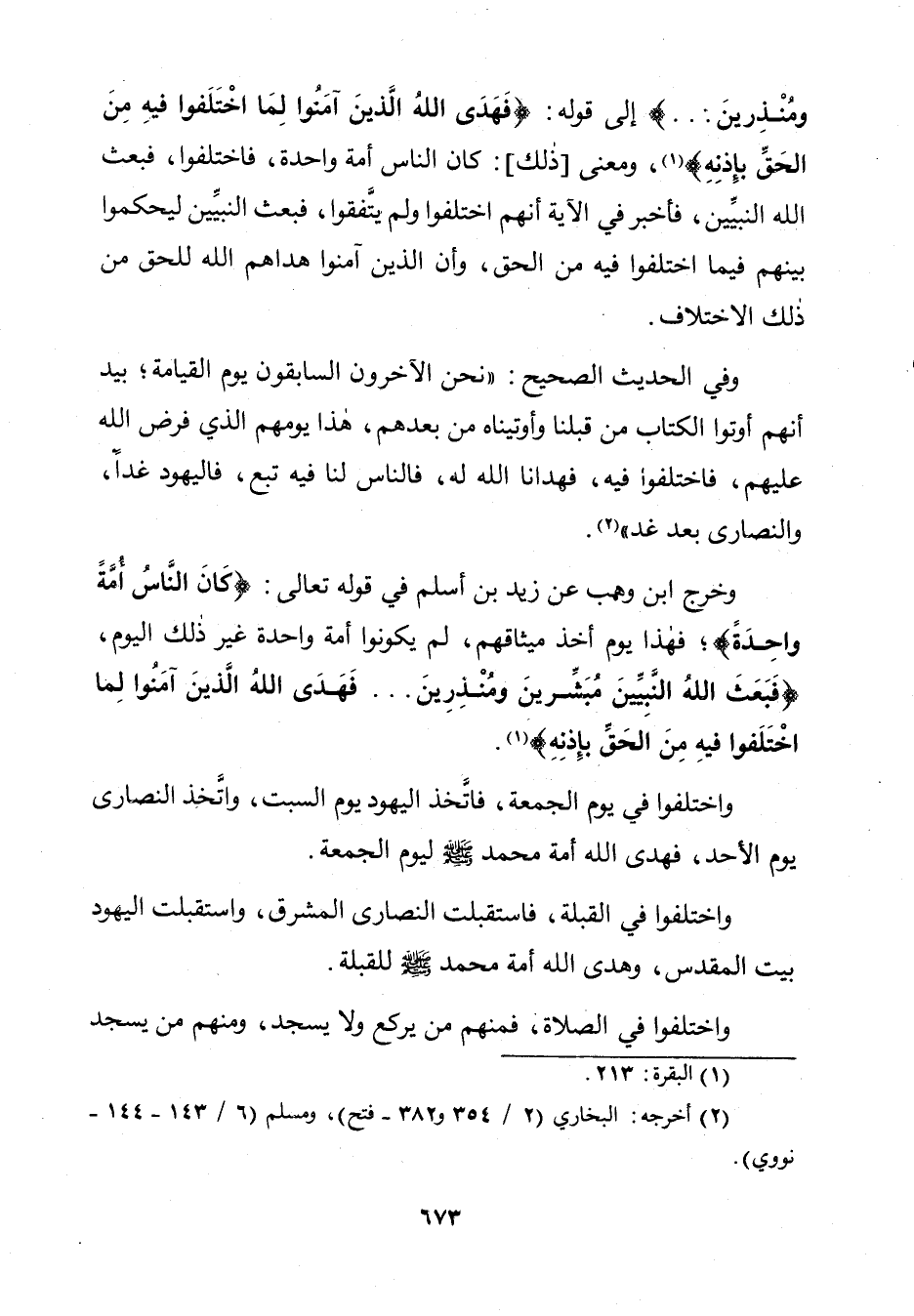 إِلَى قَوْلِهِ: {فَهَدَى اللَّهُ الَّذِينَ آمَنُوا لِمَا اخْتَلَفُوا فِيهِ مِنَ الْحَقِّ بِإِذْنِهِ} [البقرة: 213] وَمَعْنَى ذَلِكَ: كَانَ النَّاسُ أُمَّةً وَاحِدَةً فَاخْتَلَفُوا فَبَعَثَ اللَّهُ النَّبِيِّينَ فَأَخْبَرَ فِي الْآيَةِ أَنَّهُمُ اخْتَلَفُوا وَلَمْ يَتَّفِقُوا، فَبَعَثَ النَّبِيِّينَ لِيَحْكُمُوا بَيْنَهُمْ فِيمَا اخْتَلَفُوا فِيهِ مِنَ الْحَقِّ، وَأَنَّ الَّذِينَ آمَنُوا هَدَاهُمُ اللَّهُ لِلْحَقِّ مِنْ ذَلِكَ الِاخْتِلَافِ.