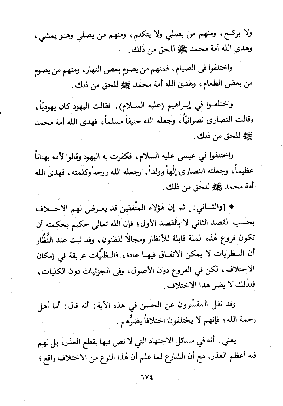 وَالثَّانِي ثُمَّ إِنَّ هَؤُلَاءِ الْمُتَّفِقِينَ قَدْ يَعْرِضُ لَهُمُ الِاخْتِلَافُ بِحَسَبِ الْقَصْدِ الثَّانِي لَا الْقَصْدِ الْأَوَّلِ، فَإِنَّ اللَّهَ تَعَالَى حَكِيمٌ بِحِكْمَتِهِ أَنْ تَكُونَ فُرُوعُ هَذِهِ الْمِلَّةِ قَابِلَةً لِلْأَنْظَارِ وَمَجَالًا لِلظُّنُونِ، وَقَدْ ثَبَتَ عِنْدَ النُّظَّارِ أَنَّ النَّظَرِيَّاتِ لَا يُمْكِنُ الِاتِّفَاقُ فِيهَا عَادَةً، فَالظَّنِّيَّاتُ عَرِيقَةٌ فِي إِمْكَانِ الِاخْتِلَافِ، لَكِنْ فِي الْفُرُوعِ دُونَ الْأُصُولِ وَفِي الْجُزْئِيَّاتِ دُونَ الْكُلِّيَّاتِ، فَلِذَلِكَ لَا يَضُرُّ هَذَا الِاخْتِلَافُ.