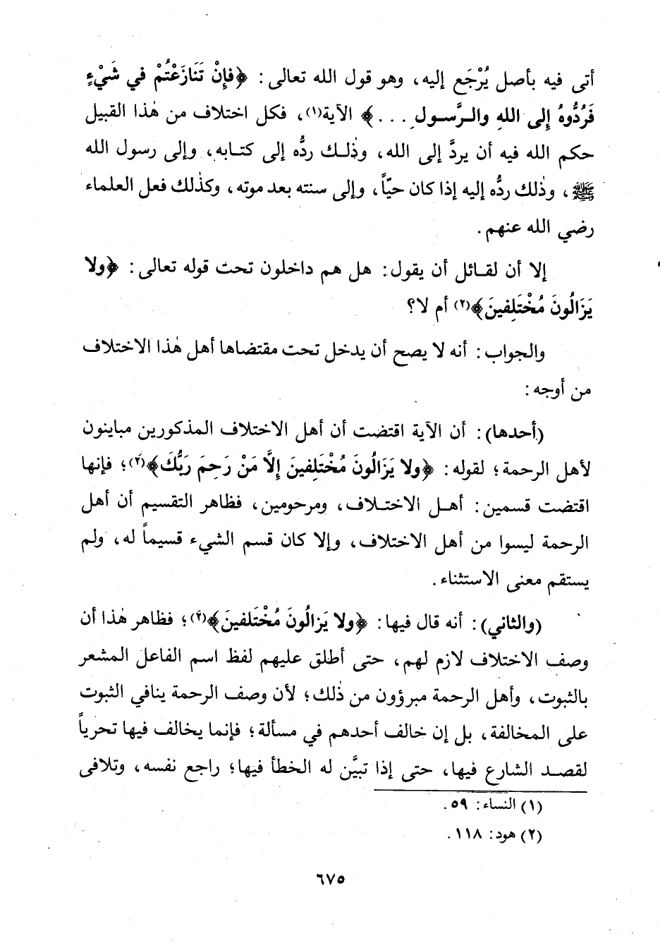وَالثَّانِي: أَنَّهُ قَالَ فِيهَا: {وَلَا يَزَالُونَ مُخْتَلِفِينَ} [هود: 118] فَظَاهِرُ هَذَا أَنَّ وَصْفَ الِاخْتِلَافِ لَازِمٌ لَهُمْ، حَتَّى أُطْلِقَ عَلَيْهِمْ لَفْظُ اسْمِ الْفَاعِلِ الْمُشْعِرِ بِالثُّبُوتِ، وَأَهْلُ الرَّحْمَةِ مُبَرَّءُونَ مِنْ ذَلِكَ، لِأَنَّ وَصْفَ الرَّحْمَةِ يُنَافِي الثُّبُوتَ عَلَى الْمُخَالَفَةِ، بَلْ إِنْ خَالَفَ أَحَدُهُمْ فِي مَسْأَلَةٍ فَإِنَّمَا يُخَالِفُ فِيهَا تَحَرِّيًا لِقَصْدِ الشَّارِعِ فِيهَا، حَتَّى إِذَا تَبَيَّنَ لَهُ الْخَطَأُ فِيهَا رَاجَعَ نَفْسَهُ وَتَلَافَى