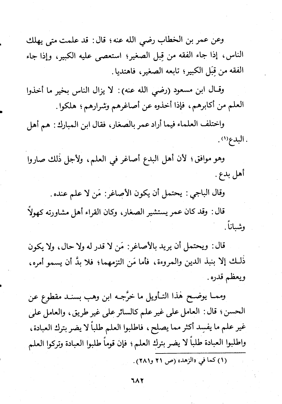 وَقَالَ ابْنُ مَسْعُودٍ ـ رَضِيَ اللَّهُ عَنْهُ ـ: لَا يَزَالُ النَّاسُ بِخَيْرٍ مَا أَخَذُوا الْعِلْمَ مِنْ أَكَابِرِهِمْ، فَإِذَا أَخَذُوهُ عَنْ أَصَاغِرِهِمْ وَشِرَارِهِمْ هَلَكُوا.