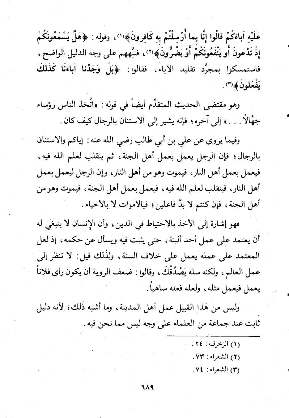 وَفِيمَا يُرْوَى عَنْ عَلِيِّ بْنِ أَبِي طَالِبٍ ـ رَضِيَ اللَّهُ عَنْهُ ـ: إِيَّاكُمْ وَالِاسْتِنَانَ بِالرِّجَالِ، فَإِنَّ الرَّجُلَ يَعْمَلُ بِعَمَلِ أَهْلِ الْجَنَّةِ ثُمَّ يَنْقَلِبُ لِعِلْمِ اللَّهِ فِيهِ فَيَعْمَلُ بِعَمَلِ أَهْلِ النَّارِ فَيَمُوتُ وَهُوَ مِنْ أَهْلِ النَّارِ، وَإِنَّ الرَّجُلَ لَيَعْمَلُ بِعَمَلِ أَهْلِ النَّارِ، فَيَنْقَلِبُ لِعِلْمِ اللَّهِ فِيهِ فَيَعْمَلُ بِعَمَلِ أَهْلِ الْجَنَّةِ فَيَمُوتُ وَهُوَ مِنْ أَهْلِ الْجَنَّةِ، فَإِنْ كُنْتُمْ لَا بُدَّ فَاعِلِينَ، فَبِالْأَمْوَاتِ لَا بِالْأَحْيَاءِ. فَهُوَ إِشَارَةٌ إِلَى الْأَخْذِ بِالِاحْتِيَاطِ فِي الدِّينِ، وَأَنَّ الْإِنْسَانَ لَا يَنْبَغِي لَهُ أَنْ يَعْتَمِدَ عَلَى عَمَلِ أَحَدٍ الْبَتَّةَ، حَتَّى يَثْبُتَ فِيهِ وَيَسْأَلَ عَنْ حُكْمِهِ، إِذْ لَعَلَّ الْمُعْتَمِدَ عَلَى عَمَلِهِ يَعْمَلُ عَلَى خِلَافِ السُّنَّةِ. وَلِذَلِكَ قِيلَ: لَا تَنْظُرْ إِلَى عَمَلِ الْعَالِمِ. وَلَكِنَّ سَلْهُ يَصْدُقْكَ. وَقَالُوا: ضَعْفُ الرَّوِيَّةِ أَنْ يَكُونَ رَأَى فُلَانًا يَعْمَلُ مِثْلَهُ. وَلَعَلَّهُ فَعَلَهُ سَاهِيًا. وَلَيْسَ مِنْ هَذَا الْقَبِيلِ عَمَلُ أَهْلِ الْمَدِينَةِ. وَمَا أَشْبَهَ ذَلِكَ. لِأَنَّهُ دَلِيلٌ ثَابِتٌ عِنْدَ جَمَاعَةٍ مِنَ الْعُلَمَاءِ عَلَى وَجْهٍ لَيْسَ مِمَّا نَحْنُ فِيهِ.