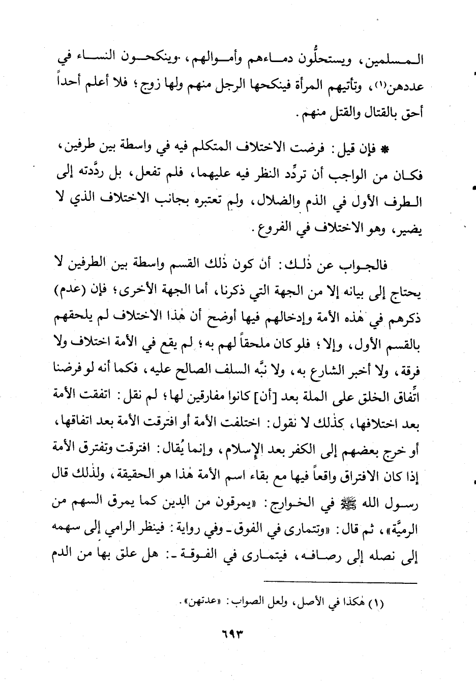 الْمُسْلِمِينَ، وَيَسْتَحِلُّونَ دِمَاءَهُمْ وَأَمْوَالَهُمْ، وَيَنْكِحُونَ النِّسَاءَ فِي عِدَدِهِنَّ، وَتَأْتِيهِمُ الْمَرْأَةُ فَيَنْكِحُهَا الرَّجُلُ مِنْهُمْ وَلَهَا زَوْجٌ، فَلَا أَعْلَمُ أَحَدًا أَحَقَّ بِالْقِتَالِ مِنْهُمْ. فَإِنْ قِيلَ: فَرَضْتُ الِاخْتِلَافَ الْمُتَكَلَّمَ فِيهِ فِي وَاسِطَةٍ بَيْنَ طَرَفَيْنِ. فَكَانَ مِنَ الْوَاجِبِ أَنْ تُرَدِّدَ النَّظَرَ فِيهِ عَلَيْهِمَا. فَلَمْ تَفْعَلْ. بَلْ رَدَدْتُهُ إِلَى الطَّرَفِ الْأَوَّلِ فِي الذَّمِّ وَالضَّلَالِ. وَلَمْ تَعْتَبِرْهُ بِجَانِبِ الِاخْتِلَافِ الَّذِي لَا يُضِيرُ، وَهُوَ الِاخْتِلَافُ فِي الْفُرُوعِ.