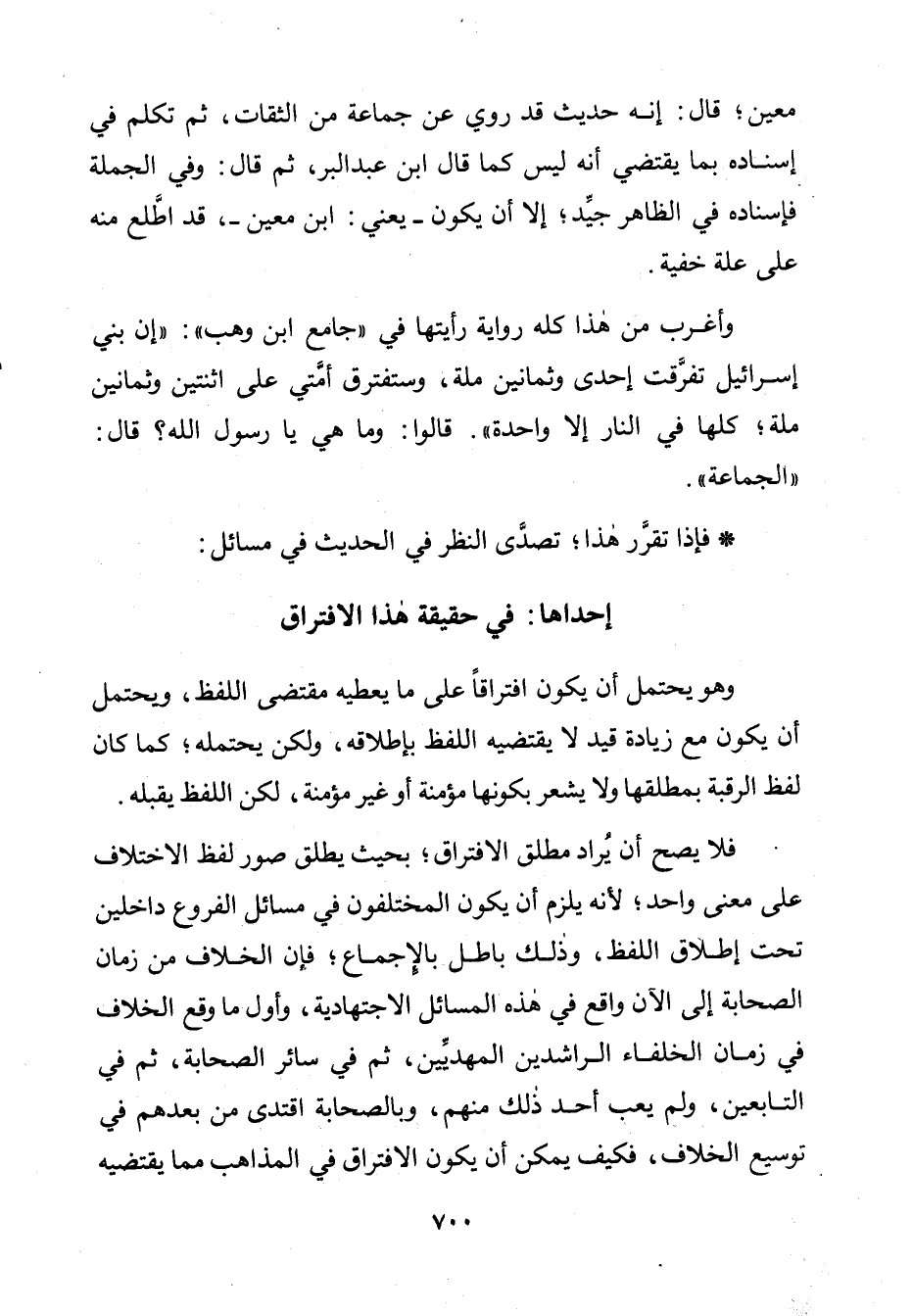 وَهُوَ يَحْتَمِلُ أَنْ يَكُونَ افْتِرَاقًا عَلَى مَا يُعْطِيهِ مُقْتَضَى اللَّفْظِ، وَيَحْتَمِلُ أَنْ يَكُونَ مَعَ زِيَادَةِ قَيْدٍ لَا يَقْتَضِيهِ اللَّفْظُ بِإِطْلَاقِهِ وَلَكِنْ يَحْتَمِلُهُ، كَمَا كَانَ لَفْظُ الرَّقَبَةِ بِمُطْلَقِهَا لَا يُشْعِرُ بِكَوْنِهَا مُؤْمِنَةً أَوْ غَيْرَ مُؤْمِنَةٍ، لَكِنَّ اللَّفْظَ يَقْبَلُهُ فَلَا يَصِحُّ أَنْ يُرَادَ مُطْلَقُ الِافْتِرَاقِ، بِحَيْثُ يُطْلَقُ صُوَرُ لَفْظِ الِاخْتِلَافِ عَلَى مَعْنًى وَاحِدٍ، لِأَنَّهُ يَلْزَمُ أَنْ يَكُونَ الْمُخْتَلِفُونَ فِي مَسَائِلِ الْفُرُوعِ دَاخِلِينَ تَحْتَ إِطْلَاقِ اللَّفْظِ، وَذَلِكَ بَاطِلٌ بِالْإِجْمَاعِ، فَإِنَّ الْخِلَافَ مِنْ زَمَانِ الصَّحَابَةِ إِلَى الْآنَ وَاقِعٌ فِي الْمَسَائِلِ الِاجْتِهَادِيَّةِ، وَأَوَّلُ مَا وَقَعَ الْخِلَافُ فِي زَمَانِ الْخُلَفَاءِ الرَّاشِدِينَ الْمَهْدِيِّينَ، ثُمَّ فِي سَائِرِ الصَّحَابَةِ، ثُمَّ التَّابِعِينَ وَلَمْ يَعِبْ أَحَدٌ ذَلِكَ مِنْهُمْ، وَبِالصَّحَابَةِ اقْتَدَى مَنْ بَعْدَهُمْ فِي تَوْسِيعِ الْخِلَافِ. فَكَيْفَ أَنْ يَكُونَ الِافْتِرَاقُ فِي الْمَذَاهِبِ مِمَّا يَقْتَضِيهِ الْحَدِيثُ؟!