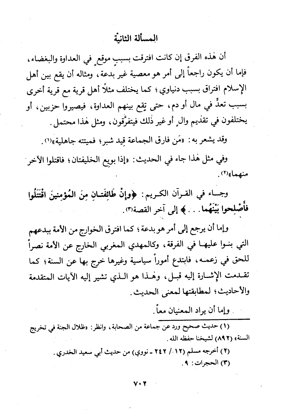 إِنَّ هَذِهِ الْفِرَقَ إِنْ كَانَتِ افْتَرَقَتْ بِسَبَبٍ مُوقِعٍ فِي الْعَدَوَاةِ وَالْبَغْضَاءِ، فَإِمَّا أَنْ يَكُونَ رَاجِعًا إِلَى أَمْرٍ هُوَ مَعْصِيَةٌ غَيْرُ بِدْعَةٍ، وَمِثَالُهُ أَنْ يَقَعَ بَيْنَ أَهْلِ الْإِسْلَامِ افْتِرَاقٌ بِسَبَبٍ دُنْيَوِيٍّ، كَمَا يَخْتَلِفُ مَثَلًا أَهْلُ قَرْيَةٍ مَعَ قَرْيَةٍ أُخْرَى بِسَبَبِ تَعَدٍّ فِي مَالٍ أَوْ دَمٍ، حَتَّى تَقَعَ بَيْنَهُمُ الْعَدَوَاةُ فَيَصِيرُوا حِزْبَيْنِ، أَوْ يَخْتَلِفُونَ فِي تَقْدِيمِ وَالٍ أَوْ غَيْرِ ذَلِكَ فَيَفْتَرِقُونَ، وَمِثْلُ هَذَا مُحْتَمَلٌ، وَقَدْ يُشْعَرُ بِهِ.