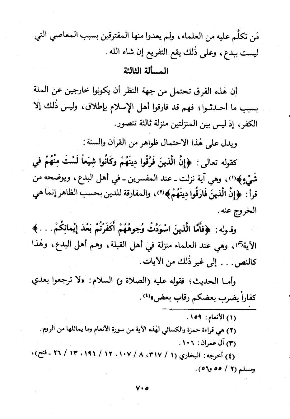 وَيَدُلُّ عَلَى هَذَا الِاحْتِمَالِ ظَوَاهِرُ مِنَ الْقُرْآنِ وَالسُّنَّةِ، كَقَوْلِهِ تَعَالَى: {إِنَّ الَّذِينَ فَرَّقُوا دِينَهُمْ وَكَانُوا شِيَعًا لَسْتَ مِنْهُمْ فِي شَيْءٍ} [الأنعام: 159] وَهِيَ آيَةٌ نَزَلَتْ - عِنْدَ الْمُفَسِّرِينَ - فِي أَهْلِ الْبِدَعِ، وَيُوَضِّحُهُ مَنْ قَرَأَ: {إِنَّ الَّذِينَ فَرَّقُوا دِينَهُمْ} [الأنعام: 159] وَالْمُفَارَقَةُ لِلدِّينِ بِحَسَبِ الظَّاهِرِ إِنَّمَا هِيَ الْخُرُوجُ عَنْهُ، وَقَوْلُهُ: {فَأَمَّا الَّذِينَ اسْوَدَّتْ وُجُوهُهُمْ أَكَفَرْتُمْ بَعْدَ إِيمَانِكُمْ} [آل عمران: 106] الْآيَةَ وَهِيَ عِنْدَ الْعُلَمَاءِ مُنَزَّلَةٌ فِي أَهْلِ الْقِبْلَةِ وَهُمْ أَهْلُ الْبِدَعِ، وَهَذَا كَالنَّصِّ، إِلَى غَيْرِ ذَلِكَ مِنَ الْآيَاتِ.