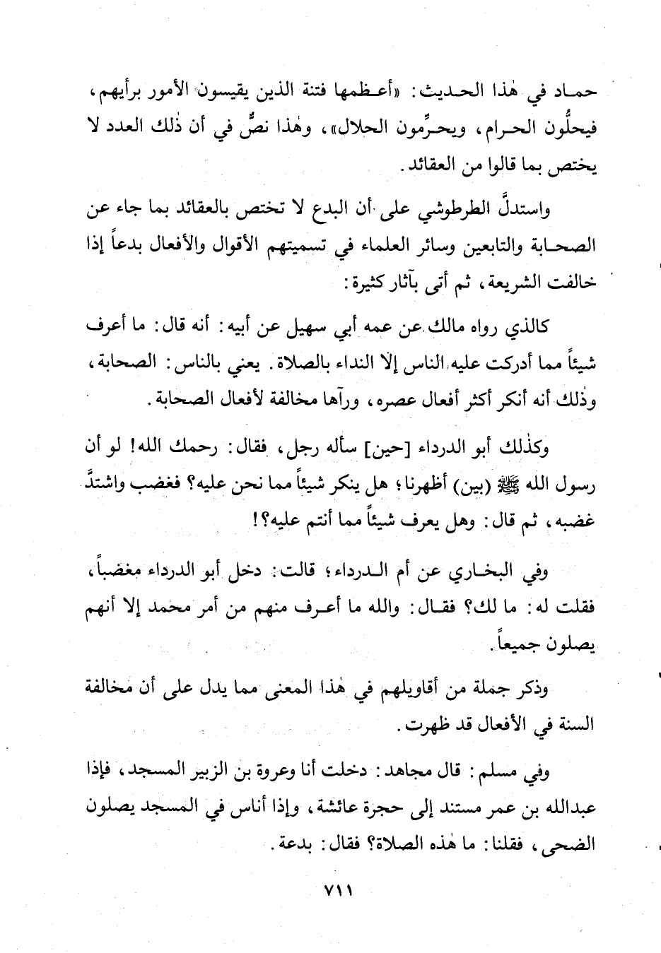 وَاسْتَدَلَّ الطَّرْطُوشِيُّ عَلَى أَنَّ الْبِدَعَ لَا تَخْتَصُّ بِالْعَقَائِدِ بِمَا جَاءَ عَنِ الصَّحَابَةِ وَالتَّابِعِينَ وَسَارَ الْعُلَمَاءُ مِنْ تَسْمِيَتِهِمُ الْأَقْوَالَ وَالْأَفْعَالَ بِدَعًا إِذَا خَالَفَتِ الشَّرِيعَةَ، ثُمَّ أَتَى بِآثَارٍ كَثِيرَةٍ كَالَّذِي رَوَاهُ مَالِكٌ عَنْ عَمِّهِ أَبِي سُهَيْلٍ عَنْ أَبِيهِ أَنَّهُ قَالَ: مَا أَعْرِفُ شَيْئًا مِمَّا أَدْرَكْتُ عَلَيْهِ النَّاسَ إِلَّا النِّدَاءَ بِالصَّلَاةِ يَعْنِي بِالنَّاسِ الصَّحَابَةَ، وَذَلِكَ أَنَّهُ أَنْكَرَ أَكْثَرَ أَفْعَالِ عَصْرِهِ، وَرَآهَا مُخَالِفَةً لِأَفْعَالِ الصَّحَابَةِ.
