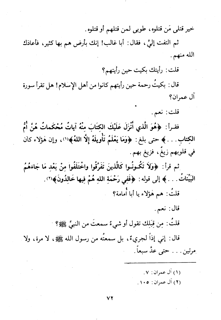قَالَ: بَكَيْتُ رَحْمَةً حِينَ رَأَيْتُهُمْ كَانُوا مِنْ أَهْلِ الْإِسْلَامِ، هَلْ تَقْرَأُ سُورَةَ آلِ عِمْرَانَ؟ قُلْتُ: نَعَمْ.