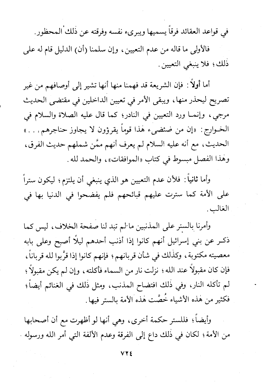 «إِنَّ مِنْ ضِئْضِئِ هَذَا قَوْمًا يَقْرَؤُونَ الْقُرْآنَ لَا يُجَاوِزُ حَنَاجِرَهُمْ» الْحَدِيثَ، مَعَ أَنَّهُ عَلَيْهِ الصَّلَاةُ وَالسَّلَامُ لَمْ يَعْرِفْ أَنَّهُمْ مِمَّنْ شَمِلَهُمْ حَدِيثُ الْفِرَقِ. وَهَذَا الْفَصْلُ مَبْسُوطٌ فِي كِتَابِ الْمُوَافَقَاتِ وَالْحَمْدُ لِلَّهِ.