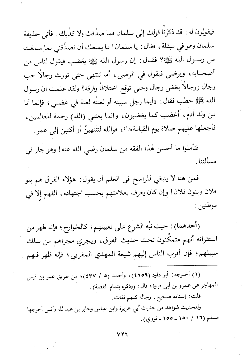 فَتَأَمَّلُوا مَا أَحْسَنَ هَذَا الْفِقْهَ مِنْ سَلْمَانَ - رَضِيَ اللَّهُ عَنْهُ -! وَهُوَ جَارٍ فِي مَسْأَلَتِنَا، فَمِنْ هُنَا لَا يَنْبَغِي لِلرَّاسِخِ فِي الْعِلْمِ أَنْ يَقُولَ: هَؤُلَاءِ الْفِرَقُ هُمْ بَنُو فُلَانٍ وَبَنُو فُلَانٍ! وَإِنْ كَانَ يَعْرِفُهُمْ بِعَلَامَتِهِمْ بِحَسَبِ اجْتِهَادِهِ، اللَّهُمَّ إِلَّا فِي مَوْطِنَيْنِ: