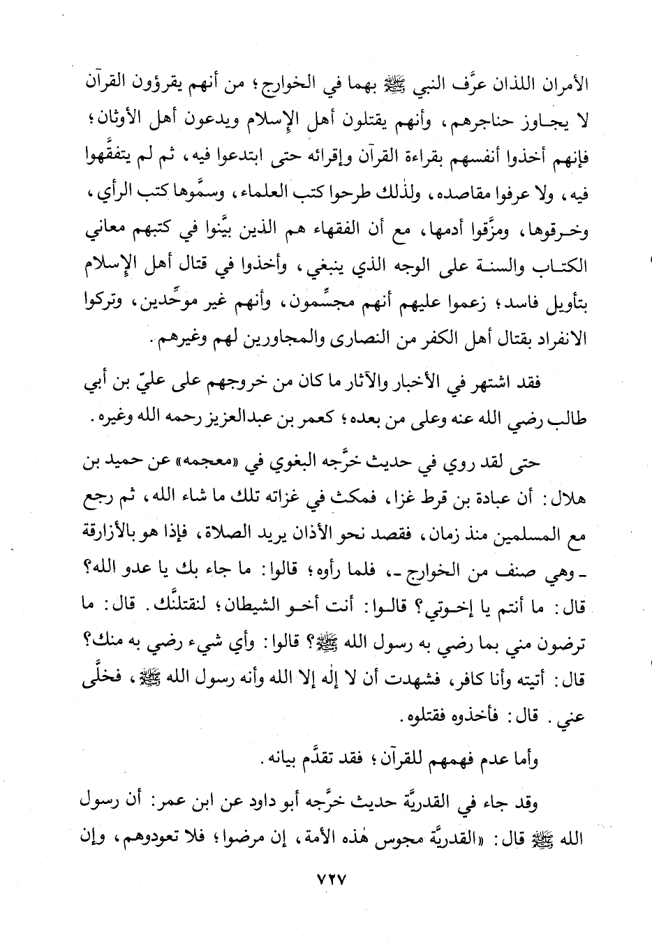 الْأَمْرَانِ اللَّذَانِ عَرَّفَ النَّبِيُّ صَلَّى اللَّهُ عَلَيْهِ وَسَلَّمَ بِهِمَا فِي الْخَوَارِجِ مِنْ أَنَّهُمْ يَقْرَؤُونَ الْقُرْآنَ لَا يُجَاوِزُ حَنَاجِرَهُمْ، وَأَنَّهُمْ يَقْتُلُونَ أَهْلَ الْإِسْلَامِ وَيَدَعُونَ أَهْلَ الْأَوْثَانِ، فَإِنَّهُمْ أَخَذُوا أَنْفُسَهُمْ بِقِرَاءَةِ الْقُرْآنِ وَإِقْرَائِهِ حَتَّى ابْتَدَعُوا فِيهِ ثُمَّ لَمْ يَتَفَقَّهُوا فِيهِ، وَلَا عَرَفُوا مَقَاصِدَهُ. وَلِذَلِكَ طَرَحُوا كُتُبَ الْعُلَمَاءِ وَسَمَّوْهَا كُتُبَ الرَّأْيِ وَخَرَقُوهَا وَمَزَّقُوا أُدُمَهَا، مَعَ أَنَّ الْفُقَهَاءَ هُمُ الَّذِينَ بَيَّنُوا فِي كُتُبِهِمْ مَعَانِيَ الْكِتَابِ وَالسُّنَّةِ عَلَى الْوَجْهِ الَّذِي يَنْبَغِي، وَأَخَذُوا فِي قِتَالِ أَهْلِ الْإِسْلَامِ بِتَأْوِيلٍ فَاسِدٍ، زَعَمُوا عَلَيْهِمْ أَنَّهُمْ مُجَسِّمُونَ وَأَنَّهُمْ غَيْرُ مُوَحِّدِينَ، وَتَرَكُوا الِانْفِرَادَ بِقِتَالِ أَهْلِ الْكُفْرِ مِنَ النَّصَارَى وَالْمُجَاوِرِينَ لَهُمْ وَغَيْرِهِمْ.