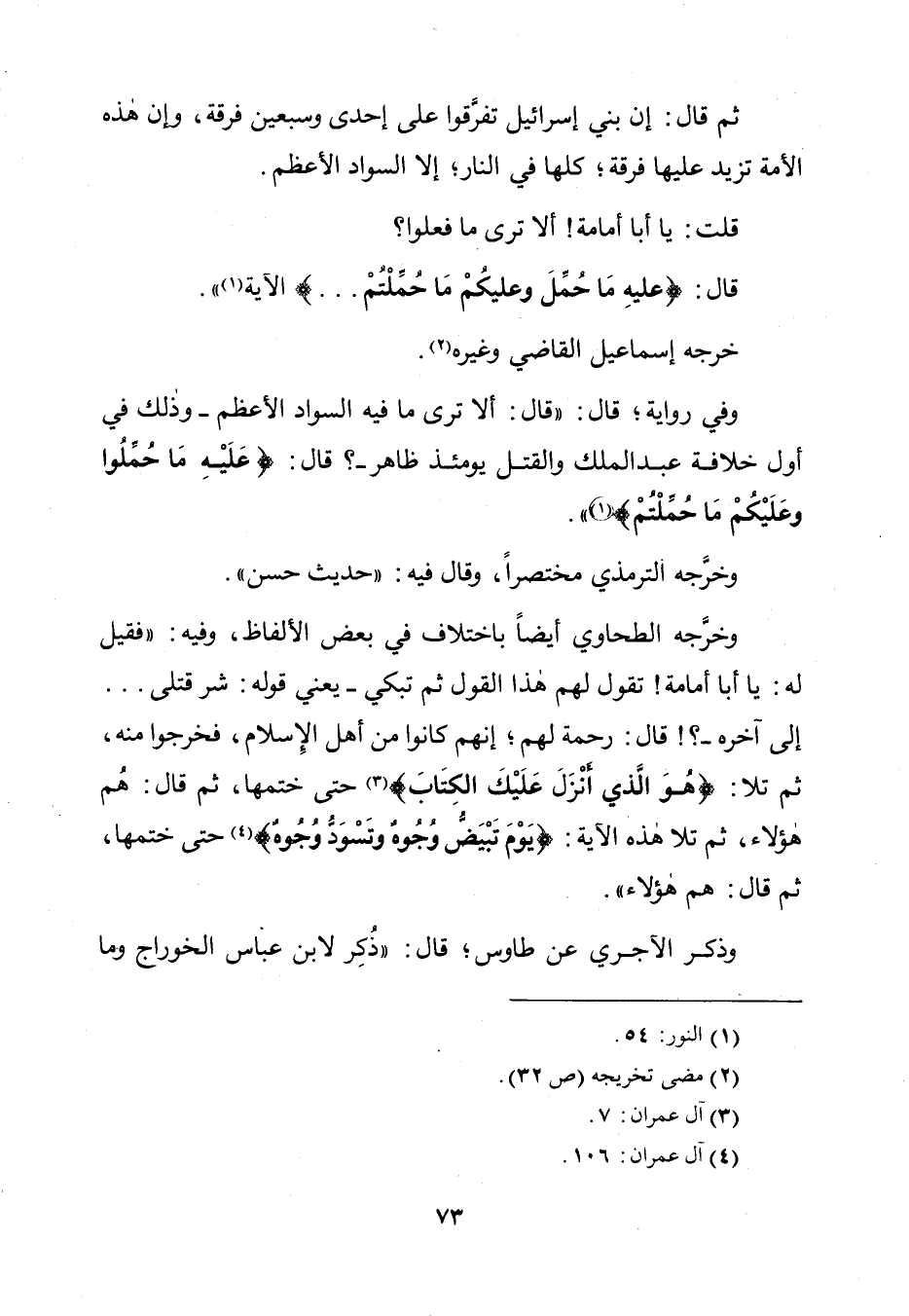 ثُمَّ قَالَ: إِنَّ بَنِي إِسْرَائِيلَ تَفَرَّقُوا عَلَى إِحْدَى وَسَبْعِينَ فِرْقَةً، وَإِنَّ هَذِهِ الْأُمَّةَ تَزِيدُ عَلَيْهَا فِرْقَةً، كُلُّهُا فِي النَّارِ; إِلَّا السَّوَادُ الْأَعْظَمُ.