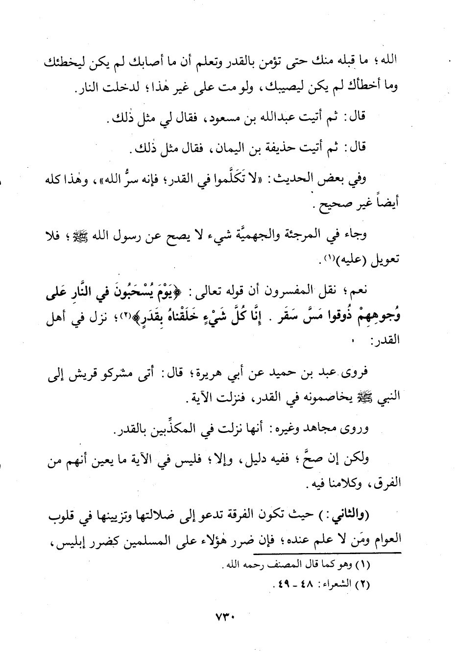 «أَتَى مُشْرِكُوا قُرَيْشٍ إِلَى النَّبِيِّ صَلَّى اللَّهُ عَلَيْهِ وَسَلَّمَ يُخَاصِمُونَهُ فِي الْقَدَرِ فَنَزَلَتِ الْآيَةُ». وَرَوَى مُجَاهِدٌ وَغَيْرُهُ أَنَّهَا نَزَلَتْ فِي الْمُكَذِّبِينَ بِالْقَدَرِ، وَلَكِنْ إِنْ صَحَّ فَفِيهِ دَلِيلٌ، وَإِلَّا فَلَيْسَ فِي الْآيَةِ مَا يُعَيِّنُ أَنَّهُمْ مِنَ الْفِرَقِ، وَكَلَامُنَا فِيهِ.