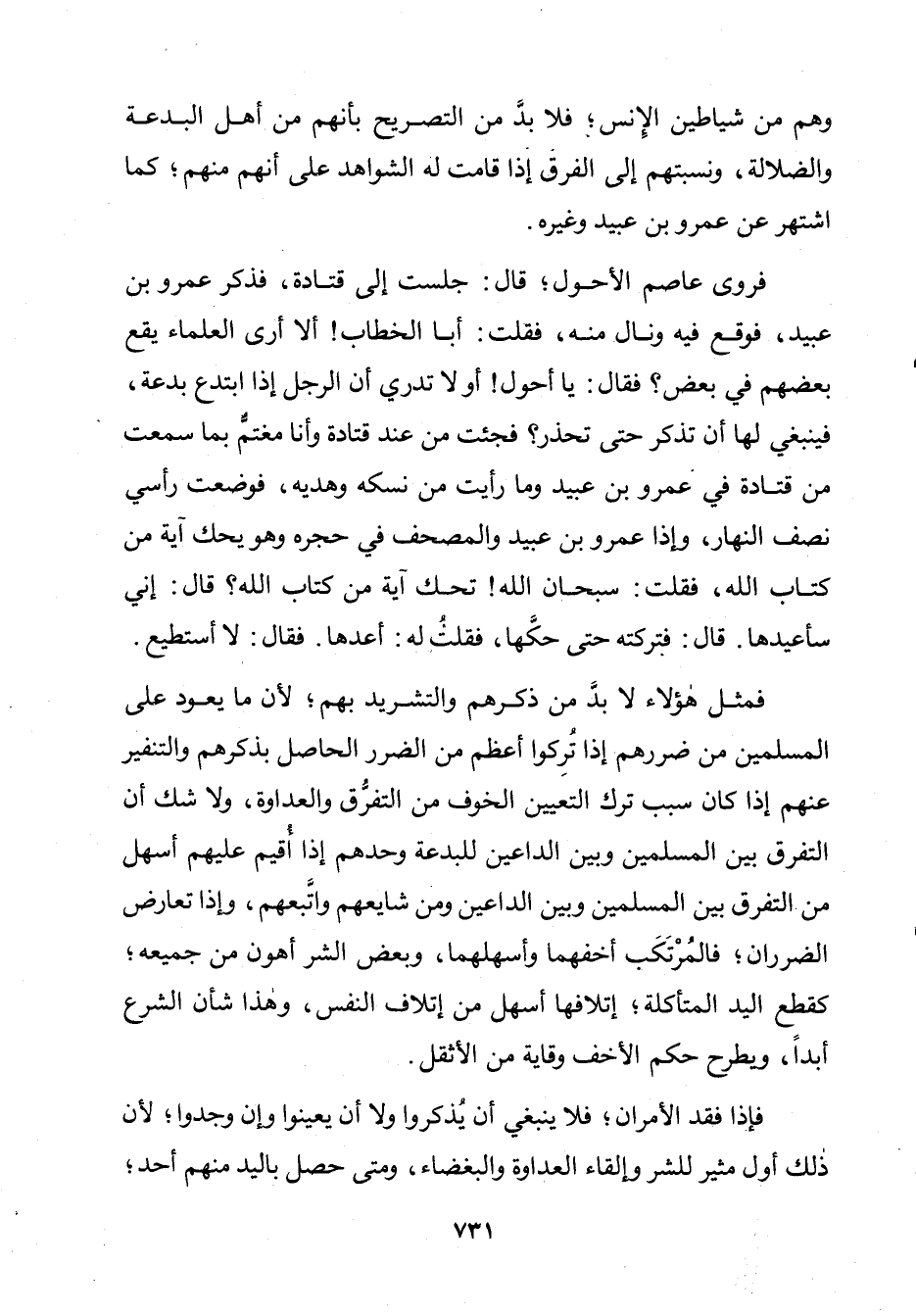 وَهُمْ مِنْ شَيَاطِينِ الْإِنْسِ، فَلَابُدَّ مِنَ التَّصْرِيحِ بِأَنَّهُمْ مِنْ أَهْلِ الْبِدْعَةِ وَالضَّلَالَةِ، وَنِسْبَتُهُمْ إِلَى الْفِرَقِ إِذَا قَامَتْ لَهُ الشُّهُودُ عَلَى أَنَّهُمْ مِنْهُمْ. كَمَا اشْتُهِرَ عَنْ عَمْرِو بْنِ عُبَيْدٍ وَغَيْرِهِ. فَرَوَى عَاصِمٌ الْأَحْوَلُ. قَالَ: جَلَسْتُ إِلَى قَتَادَةَ فَذَكَرَ عَمْرَو بْنَ عُبَيْدٍ فَوَقَعَ فِيهِ وَنَالَ مِنْهُ. فَقُلْتُ: أَبَا الْخَطَّابِ: أَلَا أَرَى الْعُلَمَاءَ يَقَعُ بَعْضُهُمْ فِي بَعْضٍ؟ فَقَالَ: يَا أَحْوَلُ أَوَلَا تَدْرِي أَنَّ الرَّجُلَ إِذَا ابْتَدَعَ بِدَعَةً فَيَنْبَغِي لَهَا أَنْ تُذْكَرَ حَتَّى تُحْذَرَ؟ فَجِئْتُ مِنْ عِنْدِ قَتَادَةَ وَأَنَا مُغْتَمٌّ بِمَا سَمِعْتُ مِنْ قَتَادَةَ فِي عَمْرِو بْنِ عُبَيْدٍ، وَمَا رَأَيْتُ مَنْ نَسُكِهِ وَهَدْيِهِ، فَوَضَعْتُ رَأْسِي نِصْفَ النَّهَارِ وَإِذَا عَمْرُو بْنُ عُبَيْدٍ وَالْمُصْحَفُ فِي حِجْرِهِ وَهُوَ يَحُكُّ آيَةً مِنْ كِتَابِ اللَّهِ. فَقُلْتُ: سُبْحَانَ اللَّهِ! تَحُكُّ آيَةً مِنْ كِتَابِ اللَّهِ؟ قَالَ إِنِّي سَأُعِيدُهَا. قَالَ: فَتَرَكْتُهُ حَتَّى حَكَّهَا. فَقُلْتُ لَهُ: أَعِدْهَا. فَقَالَ: لَا أَسْتَطِيعُ.