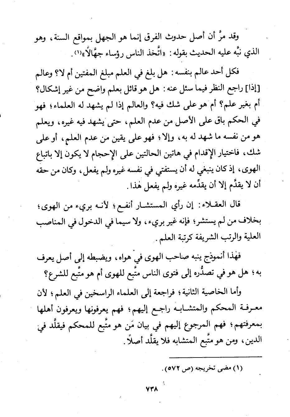 «اتَّخَذَ النَّاسُ رُؤَسَاءَ جُهَّالًا». فَكُلُّ أَحَدٍ عَالِمٌ بِنَفْسِهِ هَلْ بَلَغَ فِي الْعِلْمِ مَبْلَغَ الْمُفْتِينَ أَمْ لَا؟ وَعَالِمٌ [إِذَا] رَاجَعَ النَّظَرَ فِيمَا سُئِلَ عَنْهُ: هَلْ هُوَ قَائِلٌ بِعِلْمٍ وَاضِحٍ مِنْ غَيْرِ إِشْكَالٍ أَمْ بِغَيْرِ عِلْمٍ؟ أَمْ هُوَ عَلَى شَكٍّ فِيهِ؟ وَالْعَالِمُ إِذَا لَمْ يَشْهَدْ لَهُ الْعُلَمَاءُ فَهُوَ فِي الْحُكْمِ بَاقٍ عَلَى الْأَصْلِ مِنْ عَدَمِ الْعِلْمِ حَتَّى يَشْهَدَ فِيهِ غَيْرُهُ وَيَعْلَمَ هُوَ مِنْ نَفْسِهِ مَا شَهِدَ لَهُ بِهِ، وَإِلَّا فَهُوَ عَلَى يَقِينٍ مِنْ عَدَمِ الْعِلْمِ أَوْ عَلَى شَكٍّ، فَاخْتِيَارُ الْإِقْدَامِ فِي هَاتَيْنِ الْحَالَتَيْنِ عَلَى الْإِحْجَامِ لَا يَكُونُ إِلَّا بِاتِّبَاعِ الْهَوَى. إِذْ كَانَ يَنْبَغِي لَهُ أَنْ يَسْتَفْتِيَ فِي نَفْسِهِ غَيْرَهُ وَلَمْ يَفْعَلْ، وَكَانَ مِنْ حَقِّهِ أَنْ لَا يُقَدَّمَ إِلَّا أَنْ يُقَدِّمَهُ غَيْرُهُ، وَلَمْ يَفْعَلْ هَذَا.