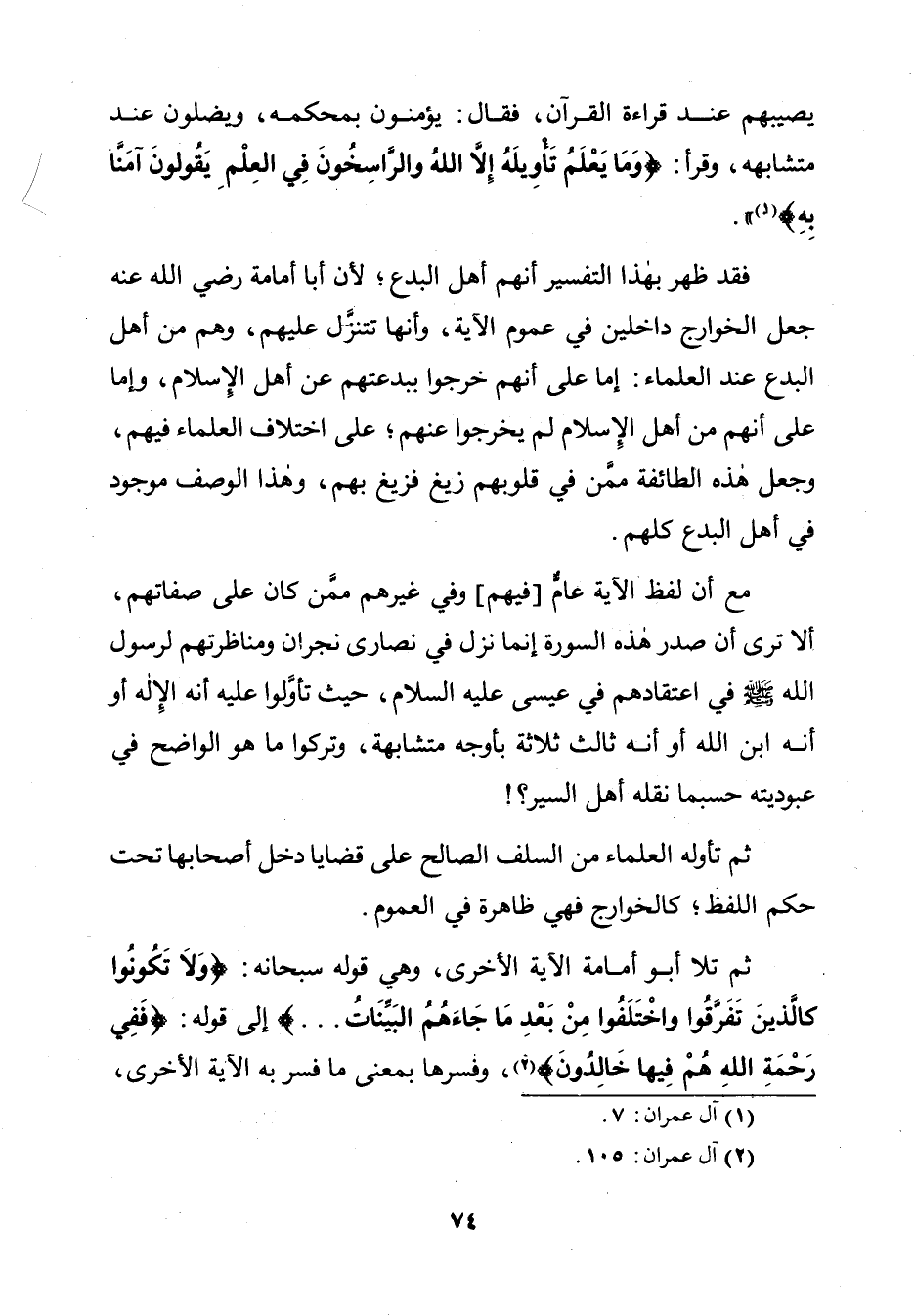 مَعَ أَنَّ لَفْظَ الْآيَةِ عَامٌّ فِيهِمْ وَفِي غَيْرِهِمْ مِمَّنْ كَانَ عَلَى صِفَاتِهِمْ، أَلَا تَرَى أَنَّ صَدْرَ هَذِهِ السُّورَةِ إِنَّمَا نَزَلَ فِي نَصَارَى نَجْرَانَ وَمُنَاظَرَتِهِمْ لِرَسُولِ اللَّهِ صَلَّى اللَّهُ عَلَيْهِ وَسَلَّمَ فِي اعْتِقَادِهِمْ فِي عِيسَى عَلَيْهِ السَّلَامُ، حَيْثُ تَأَوَّلُوا عَلَيْهِ أَنَّهُ الْإِلَهُ أَوْ أَنَّهُ ابْنُ اللَّهِ أَوْ أَنَّهُ ثَالِثُ ثَلَاثَةٍ، بِأَوْجُهٍ مُتَشَابِهَةٍ، وَتَرَكُوا مَا هُوَ الْوَاضِحُ فِي عُبُودِيَّتِهِ حَسْبَمَا نَقَلَهُ أَهْلُ السِّيَرِ؟!