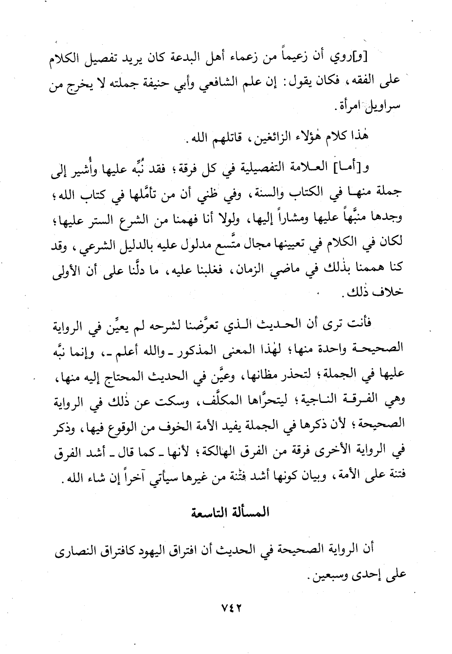 وَ [أَمَّا] الْعَلَامَةُ التَّفْصِيلِيَّةُ فِي كُلِّ فِرْقَةٍ فَقَدْ نَبِّهَ عَلَيْهَا وَأُشِيرَ إِلَى جُمْلَةٍ مِنْهَا فِي الْكِتَابِ وَالسُّنَّةِ، وَفِي ظَنِّي أَنَّ مَنْ تَأَمَّلَهَا فِي كِتَابِ اللَّهِ وَجَدَهَا مُنَبَّهًا عَلَيْهَا وَمُشَارًا إِلَيْهَا، وَلَوْلَا أَنَّا فَهِمْنَا مِنَ الشَّرْعِ السَّتْرَ عَلَيْهَا لَكَانَ فِي الْكَلَامِ فِي تَعْيِينِهَا مَجَالٌ مُتَّسِعٌ مَدْلُولٌ عَلَيْهِ بِالدَّلِيلِ الشَّرْعِيِّ، وَقَدْ كُنَّا هَمَمْنَا بِذَلِكَ فِي مَاضِي الزَّمَانِ. فَغَلَبَنَا عَلَيْهِ مَا دَلَّنَا عَلَى أَنَّ الْأَوْلَى خِلَافُ ذَلِكَ.