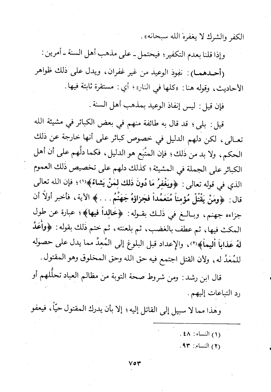 فَإِنْ قِيلَ: لَيْسَ إِنْفَاذُ الْوَعِيدِ بِمَذْهَبِ أَهْلِ السُّنَّةِ. قِيلَ: بَلَى؛ قَدْ قَالَ بِهِ طَائِفَةٌ مِنْهُمْ فِي بَعْضِ الْكَبَائِرِ فِي مَشِيئَةِ اللَّهِ تَعَالَى، لَكِنْ دَلَّهُمُ الدَّلِيلُ فِي خُصُوصِ كَبَائِرَ عَلَى أَنَّهَا خَارِجَةٌ عَنْ ذَلِكَ الْحُكْمِ، وَلَابُدَّ مِنْ ذَلِكَ، فَإِنَّ الْمُتَّبَعَ هُوَ الدَّلِيلُ، فَكَمَا دَلَّهُمْ عَلَى أَنَّ أَهْلَ الْكَبَائِرِ عَلَى الْجُمْلَةِ فِي الْمَشِيئَةِ، كَذَلِكَ دَلَّهُمْ عَلَى تَخْصِيصِ ذَلِكَ الْعُمُومِ الَّذِي فِي قَوْلِهِ تَعَالَى: {وَيَغْفِرُ مَا دُونَ ذَلِكَ لِمَنْ يَشَاءُ} [النساء: 48] فَإِنَّ اللَّهَ تَعَالَى قَالَ: {وَمَنْ يَقْتُلْ مُؤْمِنًا مُتَعَمِّدًا فَجَزَاؤُهُ جَهَنَّمُ} [النساء: 93]. فَأَخْبَرَ أَوَّلًا أَنَّ جَزَاءَهُ جَهَنَّمُ، وَبَالَغَ فِي ذَلِكَ بِقَوْلِهِ تَعَالَى: " {خَالِدًا فِيهَا} [النساء: 93] " عِبَارَةٌ عَنْ طُولِ الْمُكْثِ فِيهَا، ثُمَّ عَطَفَ بِالْغَضَبِ، ثُمَّ بِلَعْنَتِهِ، ثُمَّ خَتَمَ ذَلِكَ بِقَوْلِهِ تَعَالَى: {وَأَعَدَّ لَهُ عَذَابًا عَظِيمًا} [النساء: 93] وَالْإِعْدَادُ قَبْلَ الْبُلُوغِ إِلَى الْمُعَدِّ مِمَّا يَدُلُّ عَلَى حُصُولِهِ لِلْمُعَدِّ لَهُ، وَلِأَنَّ الْقَتْلَ اجْتَمَعَ فِيهِ حَقُّ اللَّهِ وَحَقُّ الْمَخْلُوقِ وَهُوَ الْمَقْتُولُ.
