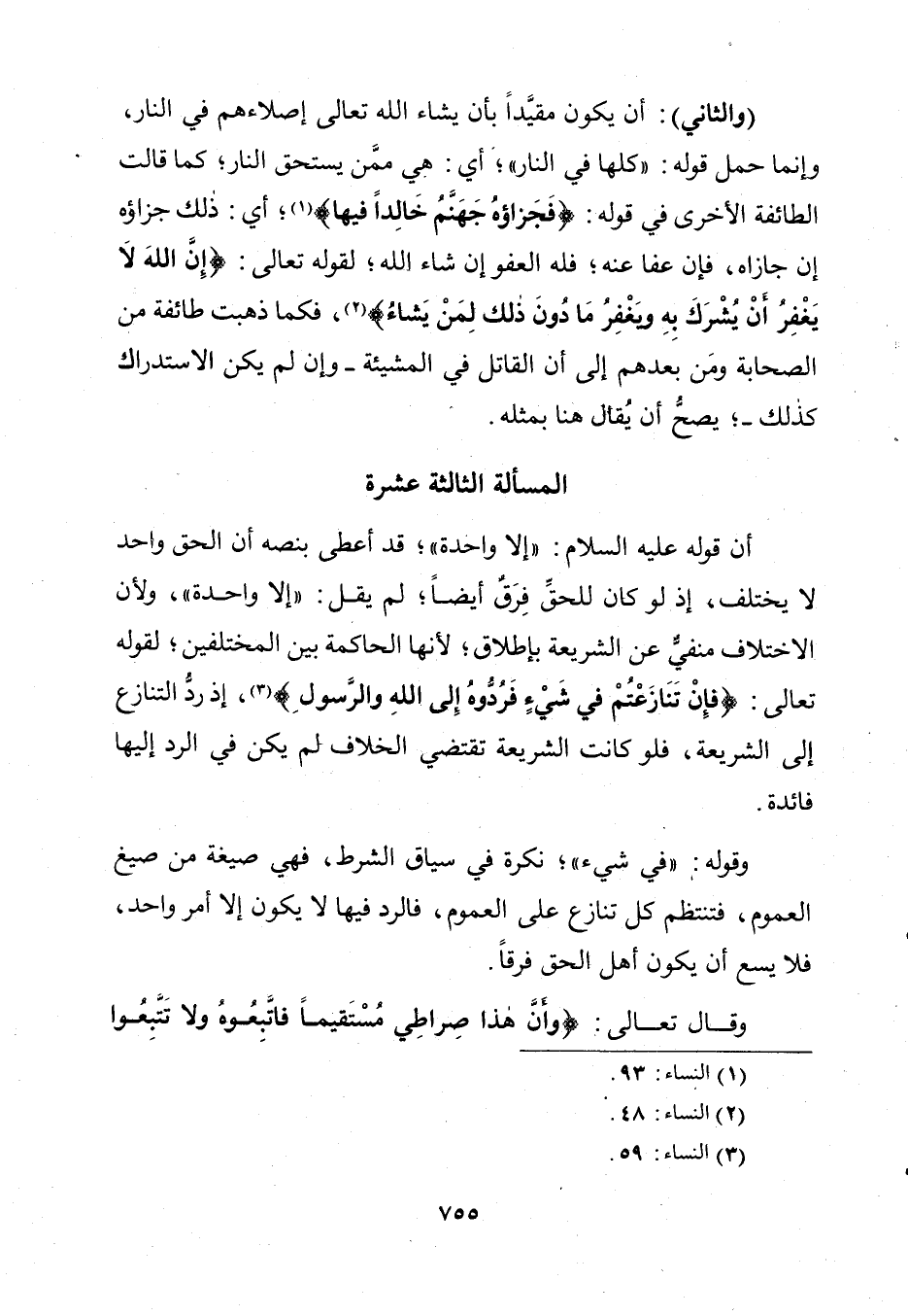 إِنَّ قَوْلَهُ عَلَيْهِ الصَّلَاةُ وَالسَّلَامُ: إِلَّا وَاحِدَةً قَدْ أَعْطَى بِنَصِّهِ أَنَّ الْحَقَّ وَاحِدٌ لَا يَخْتَلِفُ، إِذْ لَوْ كَانَ لِلْحَقِّ فِرَقٌ أَيْضًا لَمْ يَقُلْ إِلَّا وَاحِدَةً وَلِأَنَّ الِاخْتِلَافَ مَنْفِيٌّ عَنِ الشَّرِيعَةِ بِإِطْلَاقٍ، لِأَنَّهَا الْحَاكِمَةُ بَيْنَ الْمُخْتَلِفِينَ، لِقَوْلِهِ تَعَالَى: {فَإِنْ تَنَازَعْتُمْ فِي شَيْءٍ فَرُدُّوهُ إِلَى اللَّهِ وَالرَّسُولِ} [النساء: 59] إِذْ رَدُّ التَّنَازُعِ إِلَى الشَّرِيعَةِ، فَلَوْ كَانَتِ الشَّرِيعَةُ تَقْتَضِي الْخِلَافَ لَمْ يَكُنْ فِي الرَّدِّ إِلَيْهَا فَائِدَةٌ. وَقَوْلُهُ: فِي شَيْءٍ نَكِرَةٌ فِي سِيَاقِ الشَّرْطِ، فَهِيَ صِيغَةٌ مِنْ صِيَغِ الْعُمُومِ. فَتَنْتَظِمُ كُلُّ تَنَازُعٍ عَلَى الْعُمُومِ، فَالرَّدُّ فِيهَا لَا يَكُونُ إِلَّا لِأَمْرٍ وَاحِدٍ فَلَا يَسَعُ أَنْ يَكُونَ أَهْلُ الْحَقِّ فِرَقًا. وَقَالَ تَعَالَى: {وَأَنَّ هَذَا صِرَاطِي مُسْتَقِيمًا فَاتَّبِعُوهُ وَلَا تَتَّبِعُوا السُّبُلَ} [الأنعام: 153]