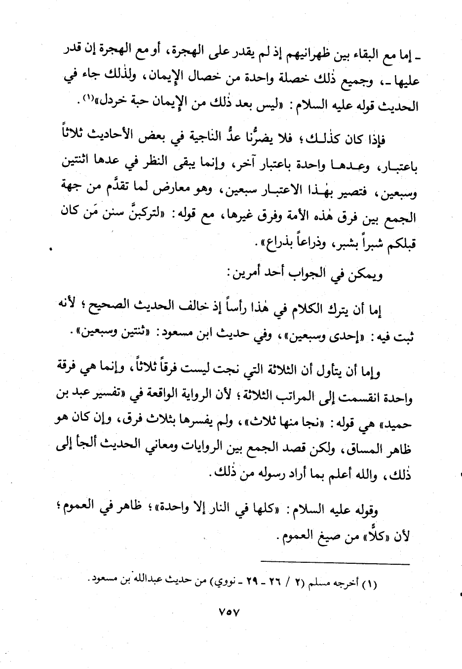 فَإِذَا كَانَ كَذَلِكَ فَلَا يَضُرُّنَا عَدُّ النَّاجِيَةِ فِي بَعْضِ الْأَحَادِيثِ ثَلَاثًا بِاعْتِبَارٍ، وَعَدُّهَا وَاحِدَةً بِاعْتِبَارٍ آخَرَ، وَإِنَّمَا يَبْقَى النَّظَرُ فِي عَدِّهَا اثْنَتَيْنِ وَسَبْعِينَ، فَتَصِيرُ بِهَذَا الِاعْتِبَارِ سَبْعِينَ، وَهُوَ مُعَارِضٌ لِمَا تَقَدَّمَ مِنْ جِهَةِ الْجَمْعِ بَيْنَ فِرَقِ هَذِهِ الْأُمَّةِ وَفِرَقِ غَيْرِهَا، مَعَ قَوْلِهِ: «لَتَرْكَبُنَّ سَنَنَ مَنْ كَانَ قَبْلَكُمْ شِبْرًا بِشِبْرٍ وَذِرَاعًا بِذِرَاعٍ».