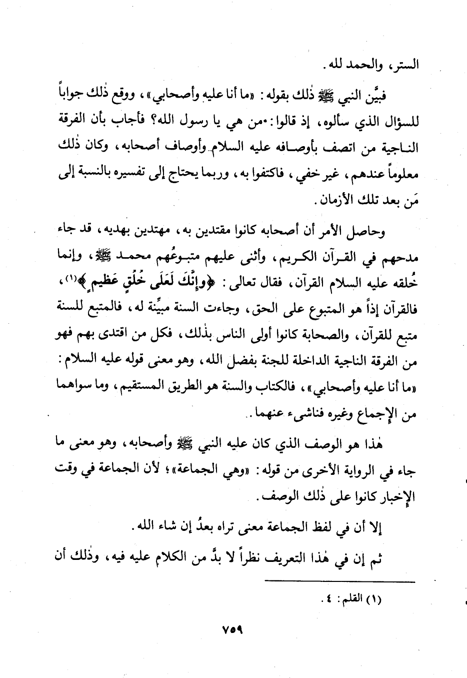 السَّتْرِ، وَالْحَمْدُ لِلَّهِ، فَبَيَّنَ النَّبِيُّ صَلَّى اللَّهُ عَلَيْهِ وَسَلَّمَ ذَلِكَ بِقَوْلِهِ مَا أَنَا عَلَيْهِ وَأَصْحَابِي، وَوَقَعَ ذَلِكَ جَوَابًا لِلسُّؤَالِ الَّذِي سَأَلُوهُ إِذْ قَالُوا: مَنْ هِيَ يَا رَسُولَ اللَّهِ؟ فَأَجَابَ بِأَنَّ الْفِرْقَةَ النَّاجِيَةَ مَنِ اتَّصَفَ بِأَوْصَافِهِ عَلَيْهِ الصَّلَاةُ وَالسَّلَامُ وَأَوْصَافِ أَصْحَابِهِ. وَكَانَ ذَلِكَ مَعْلُومًا عِنْدَهُمْ غَيْرَ خَفِيٍّ فَاكْتَفَوْا بِهِ. وَرُبَّمَا يَحْتَاجُ إِلَى تَفْسِيرٍ بِالنِّسْبَةِ إِلَى مَنْ بَعْدَ تِلْكَ الْأَزْمَانِ.
