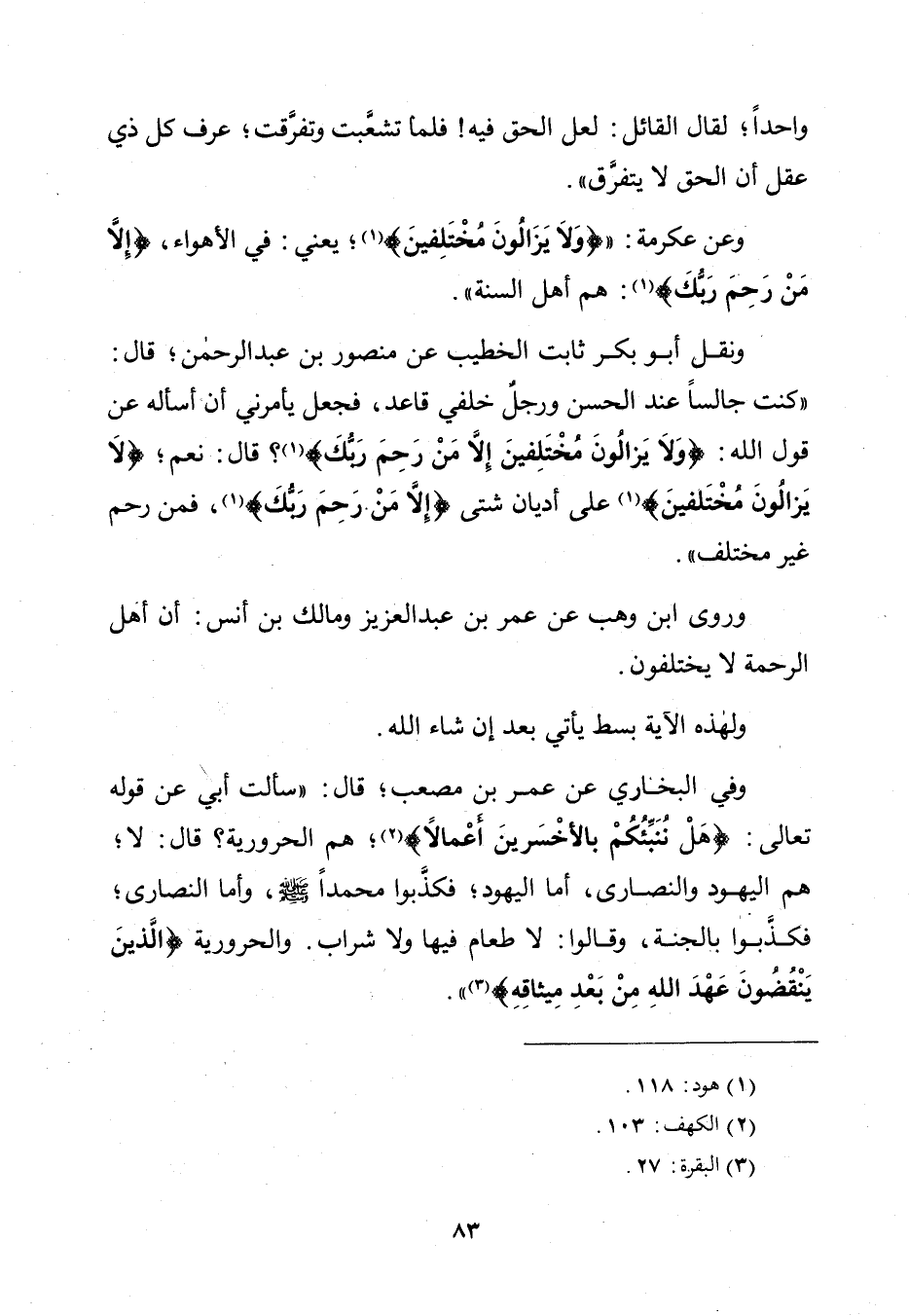 وَعَنْ عِكْرِمَةَ {وَلَا يَزَالُونَ مُخْتَلِفِينَ} [هود: 118] يَعْنِي فِي الْأَهْوَاءِ {إِلَّا مَنْ رَحِمَ رَبُّكَ} [هود: 119] هُمْ أَهْلُ السُّنَّةِ.
