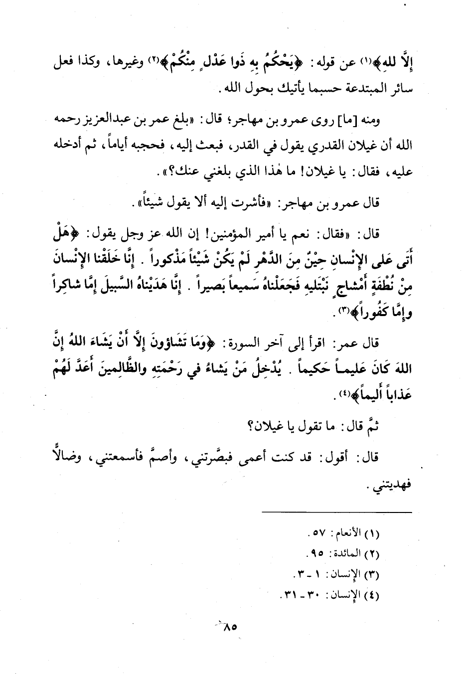 وَمِنْهُ [مَا] رَوَى عَمْرُو بْنُ مُهَاجِرٍ ; قَالَ: " بَلَغَ عُمَرُ بْنُ عَبْدِ الْعَزِيزِ رَحِمَهُ اللَّهُ أَنَّ غَيْلَانَ الْقَدَرِيَّ يَقُولُ فِي الْقَدَرِ، فَبَعَثَ إِلَيْهِ، فَحَجَبَهُ أَيَّامًا، ثُمَّ أَدْخَلَهُ عَلَيْهِ فَقَالَ: يَا غَيْلَانُ! مَا هَذَا الَّذِي بَلَغَنِي عَنْكَ؟ ".
