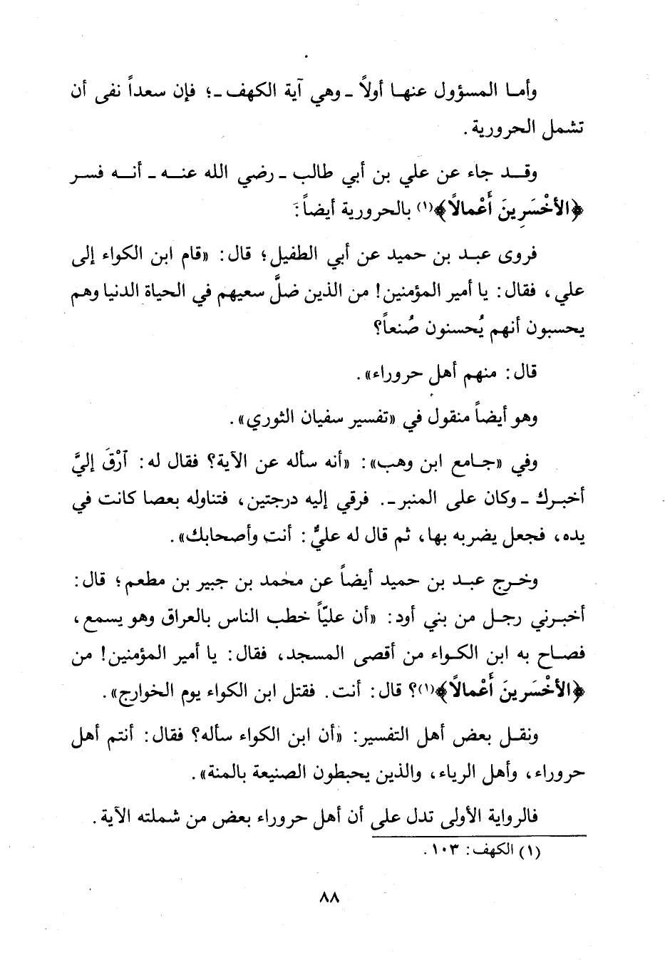 وَقَدْ جَاءَ عَنْ عَلِيِّ بْنِ أَبِي طَالِبٍ رَضِيَ اللَّهُ عَنْهُ أَنَّهُ فَسَّرَ (الْأَخْسَرِينَ أَعْمَالًا) بِالْحَرُورِيَّةِ أَيْضًا.