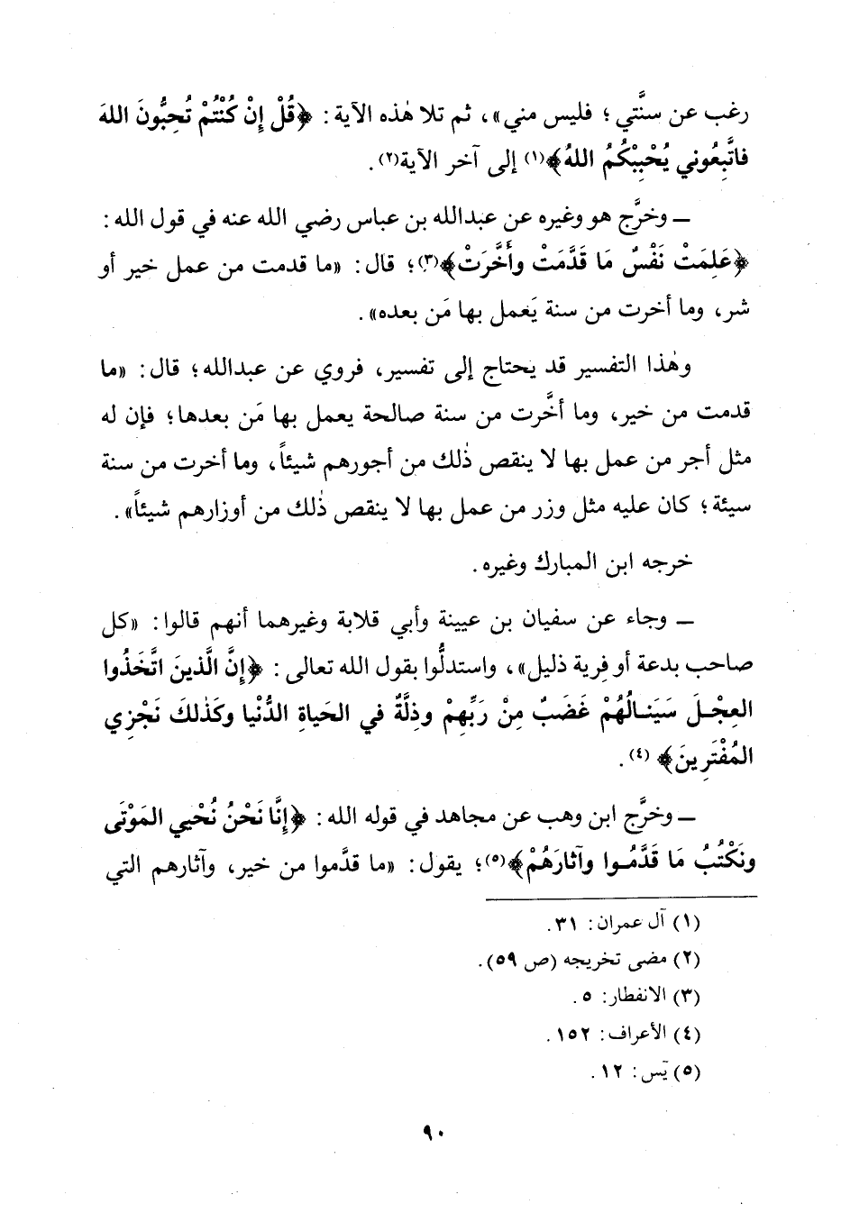 وَخَرَّجَ هُوَ وَغَيْرُهُ عَنْ عَبْدِ اللَّهِ بْنِ عَبَّاسٍ رَضِيَ اللَّهُ عَنْهُ فِي قَوْلِ اللَّهِ: {عَلِمَتْ نَفْسٌ مَا قَدَّمَتْ وَأَخَّرَتْ} [الانفطار: 5] ; قَالَ: " مَا قَدَّمَتْ مِنْ عَمَلِ خَيْرٍ أَوْ شَرٍّ، وَمَا أَخَّرَتْ مِنْ سُنَّةٍ يُعْمَلُ بِهَا مِنْ بَعْدِهِ ".