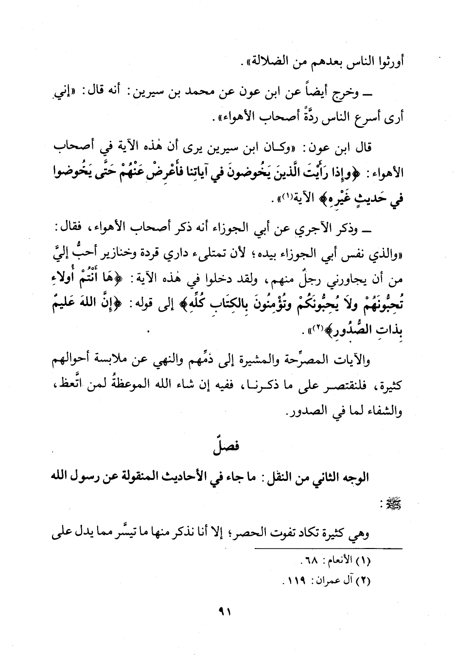 قَالَ ابْنُ عَوْنٍ: " وَكَانَ ابْنُ سِيرِينَ يَرَى أَنَّ هَذِهِ الْآيَةَ فِي أَصْحَابِ الْأَهْوَاءِ: {وَإِذَا رَأَيْتَ الَّذِينَ يَخُوضُونَ فِي آيَاتِنَا فَأَعْرِضْ عَنْهُمْ حَتَّى يَخُوضُوا فِي حَدِيثٍ غَيْرِهِ} [الأنعام: 68].