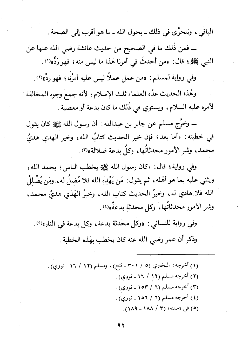 وَخَرَّجَ مُسْلِمٌ، عَنْ جَابِرِ بْنِ عَبْدِ اللَّهِ: أَنَّ رَسُولَ اللَّهِ صَلَّى اللَّهُ عَلَيْهِ وَسَلَّمَ كَانَ يَقُولُ فِي خُطْبَتِهِ: " «أَمَّا بَعْدُ، فَإِنَّ خَيْرَ الْحَدِيثِ كِتَابُ اللَّهِ، وَخَيْرَ الْهَدْيِ هَدْيُ مُحَمَّدٍ، وَشَرَّ الْأُمُورِ مُحْدَثَاتُهَا، وَكُلُّ بِدْعَةٍ ضَلَالَةٌ» ".