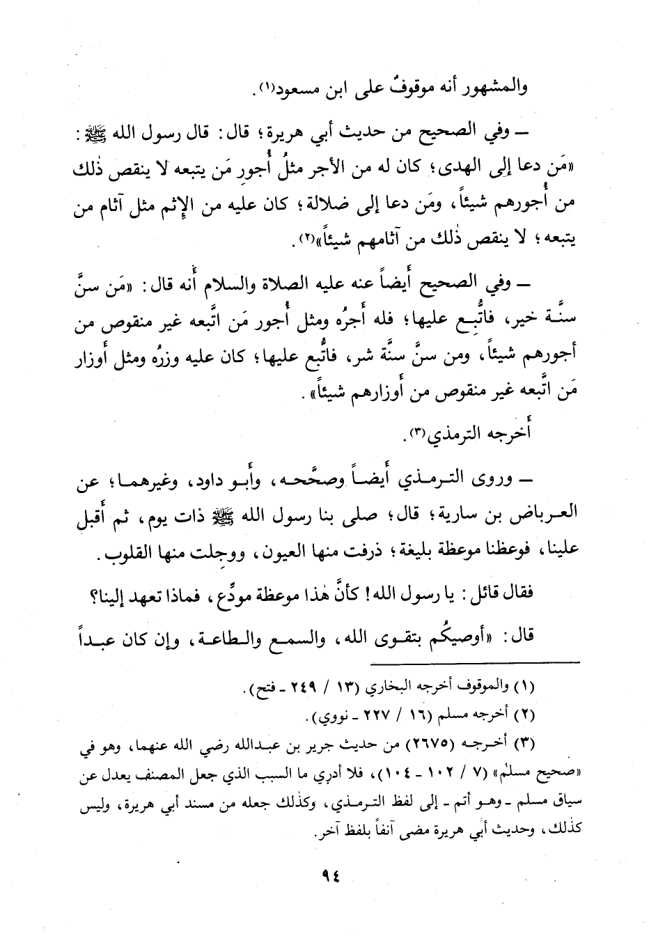 وَرَوَى التِّرْمِذِيُّ أَيْضًا وَصَحَّحَهُ، وَأَبُو دَاوُدَ وَغَيْرُهُمَا عَنِ الْعِرْبَاضِ بْنِ سَارِيَةَ قَالَ: «صَلَّى بِنَا رَسُولُ اللَّهِ صَلَّى اللَّهُ عَلَيْهِ وَسَلَّمَ ذَاتَ يَوْمٍ ثُمَّ أَقْبَلَ عَلَيْنَا فَوَعَظَنَا مَوْعِظَةً بَلِيغَةً ذَرَفَتْ مِنْهَا الْعُيُونُ وَوَجِلَتْ مِنْهَا الْقُلُوبُ. فَقَالَ قَائِلٌ: يَا رَسُولَ اللَّهِ؟ كَأَنَّ هَذَا مَوْعِظَةُ مُوَدِّعٍ، فَمَاذَا تَعْهَدُ إِلَيْنَا؟