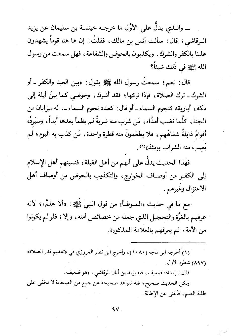 وَالَّذِي يَدُلُّ عَلَى الْأَوَّلِ مَا خَرَّجَهُ خَيْثَمَةُ بْنُ سُلَيْمَانَ عَنْ يَزِيدَ الرَّقَاشِيِّ ; قَالَ: سَأَلْتُ أَنَسَ بْنَ مَالِكٍ، فَقُلْتُ: إِنَّ هَاهُنَا قَوْمًا يَشْهَدُونَ عَلَيْنَا بِالْكُفْرِ وَالشِّرْكِ، وَيُكَذِّبُونَ بِالْحَوْضِ وَالشَّفَاعَةِ، فَهَلْ سَمِعْتَ مِنْ رَسُولِ اللَّهِ صَلَّى اللَّهُ عَلَيْهِ وَسَلَّمَ فِي ذَلِكَ شَيْئًا؟ قَالَ: نَعَمْ; سَمِعْتُ رَسُولَ اللَّهِ صَلَّى اللَّهُ عَلَيْهِ وَسَلَّمَ يَقُولُ: «بَيْنَ الْعَبْدِ وَالْكُفْرِ أَوِ الشِّرْكِ تَرْكُ الصَّلَاةِ، فَإِذَا تَرَكَهَا فَقَدْ أَشْرَكَ، وَحَوْضِي كَمَا بَيْنَ أَيْلَةَ إِلَى مَكَّةَ، أَبَارِيقُهُ كَنُجُومِ السَّمَاءِ أَوْ قَالَ: كَعَدَدِ نُجُومِ السَّمَاءِ، لَهُ مِيزَابَانِ مِنَ الْجَنَّةِ، كُلَّمَا نَضَبَ أَمَدَّاهُ، مَنْ شَرِبَ مِنْهُ شَرْبَةً لَمْ يَظْمَأْ بَعْدَهَا أَبَدًا، وَسَيَرِدُهُ أَقْوَامٌ ذَابِلَةٌ شِفَاهُهُمْ، فَلَا يُطْعَمُونَ مِنْهُ قَطْرَةً وَاحِدَةً. مَنْ كَذَّبَ بِهِ الْيَوْمَ، لَمْ يُصِبْ مِنْهُ الشَّرَابَ يَوْمَئِذٍ».