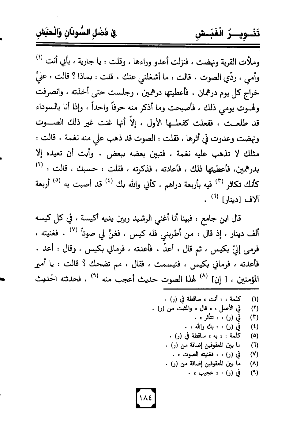 وملأت الْقرْبَة ونهضت، فَنزلت أعدُّوا وَرَاءَهَا، وَقلت: يَا جَارِيَة، بِأبي أَنْت وَأمي، ردي الصَّوْت. قَالَت: مَا أشغلني عَنْك. قلت: بِمَاذَا؟ قَالَت: عَليّ خراج كل يَوْم دِرْهَمَانِ. فأعطيتها دِرْهَمَيْنِ، وَجَلَست حَتَّى أَخَذته، وانصرفت ولهوت يومي ذَلِك، فَأَصْبَحت وَمَا أذكر مِنْهُ حرفا وَاحِدًا، وَإِذا أَنا بِالسَّوْدَاءِ قد طلعت، فَفعلت كفعلها الأول، إِلَّا أَنَّهَا غنت غير ذَلِك الصَّوْت ونهضت وعدوت فِي أَثَرهَا، فَقلت: الصَّوْت قد ذهب عَليّ مِنْهُ نَغمَة. قَالَت: مثلك لَا تذْهب عَلَيْهِ نَغمَة، فَتبين بعضه بِبَعْض. وأبت أَن تعيده إِلَّا بِدِرْهَمَيْنِ، فأعطيتها ذَلِك، فأعادته، فَذَكرته، فَقلت: حَسبك، قَالَت: كَأَنَّك تكاثر فِيهِ بأَرْبعَة دَرَاهِم، كَأَنِّي وَالله بك قد أصبت بِهِ أَرْبَعَة آلَاف [دِينَار] .