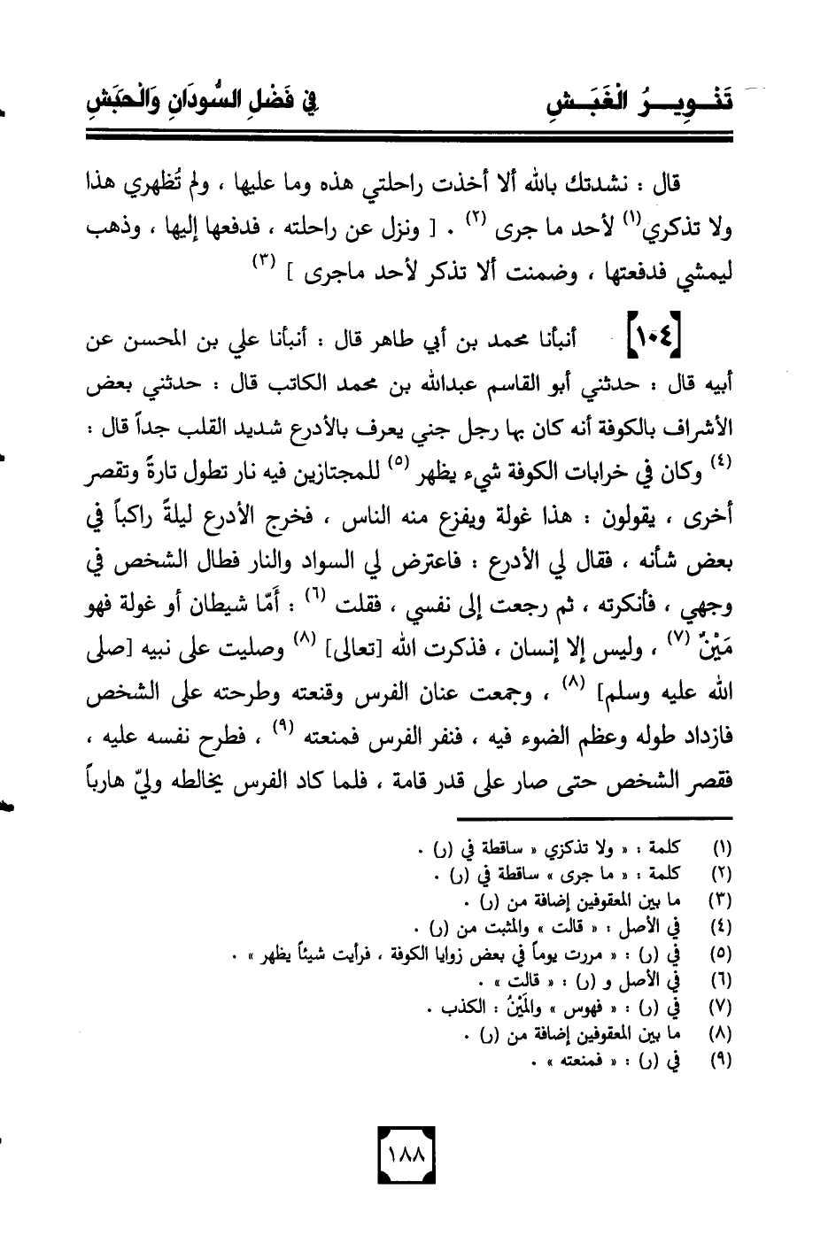 [104] أَنبأَنَا مُحَمَّد بن أبي طَاهِر قَالَ: أَنبأَنَا عَليّ بن المحسن عَن أَبِيه قَالَ: حَدثنِي أَبُو الْقَاسِم عبد اللَّهِ بن مُحَمَّد الْكَاتِب قَالَ: حَدثنِي بعض الْأَشْرَاف بِالْكُوفَةِ أَنه كَانَ بهَا رجل جني يعرف بالأدرع شَدِيد الْقلب جدا قَالَ: وَكَانَ فِي خرابات الْكُوفَة شَيْء يظْهر للمجتازين فِيهِ نَار تطول تَارَة وتقصر أُخْرَى، يَقُولُونَ: هَذَا غولة ويفزع مِنْهُ النَّاس، فَخرج الأدرع لَيْلَة رَاكِبًا فِي بعض شَأْنه، فَقَالَ لي الأدرع: فَاعْترضَ لي السوَاد وَالنَّار فطال الشَّخْص فِي وَجْهي، فأنكرته، ثمَّ رجعت إِلَى نَفسِي، فَقلت: إِمَّا شَيْطَان أَو غولة فَهُوَ مين، وَلَيْسَ إِلَّا إِنْسَان، فَذكرت اللَّهِ [تَعَالَى] وَصليت على نبيه [صلى اللَّهِ عَلَيْهِ وَسلم] ، وجمعت عنان الْفرس وقنعته وطرحته على الشَّخْص فازداد طوله وَعظم الضَّوْء فِيهِ، فنفر الْفرس فمنعته، فَطرح نَفسه عَلَيْهِ، فقصر الشَّخْص حَتَّى صَار على قدر قامة، فَلَمَّا كَاد الْفرس يخالطه ولى هَارِبا