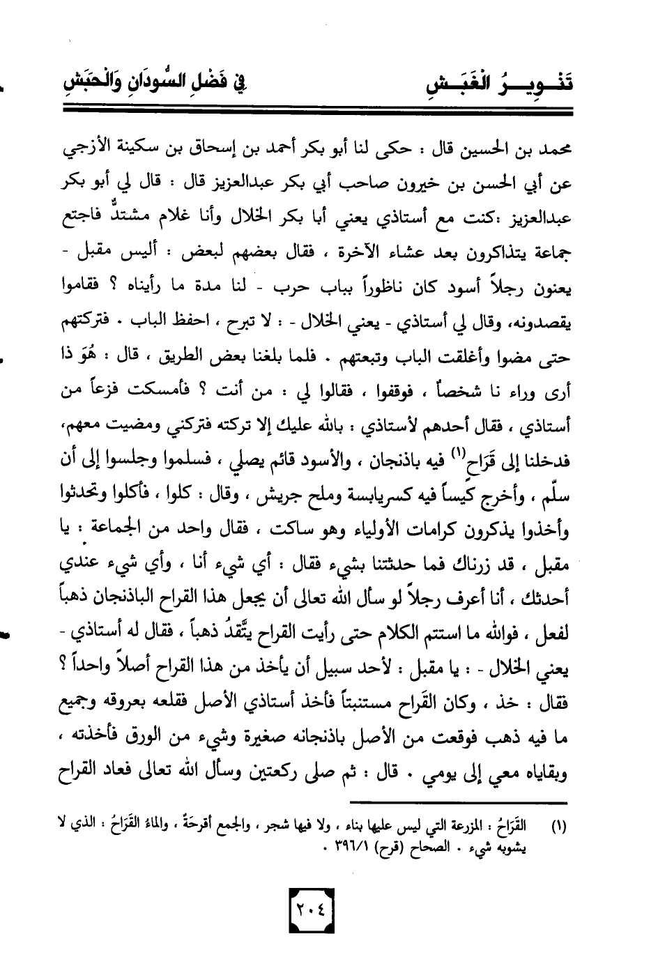 مُحَمَّد بن الْحُسَيْن قَالَ: حكى لنا أَبُو بكر أَحْمد بن إِسْحَاق بن سكينَة الْأَزجيّ عَن أبي الْحسن بن خيرون صَاحب أبي بكر عبد الْعَزِيز قَالَ: قَالَ لي أَبُو بكر عبد الْعَزِيز: كنت مَعَ أستاذي يَعْنِي أَبَا بكر الْخلال وَأَنا غُلَام مشتد فَاجْتمع جمَاعَة يتذاكرون بعد عشَاء الْآخِرَة، فَقَالَ بَعضهم لبَعض: أَلَيْسَ مقبل - يعنون رجلا أسود كَانَ ناظورا بِبَاب حَرْب - لنا مُدَّة مَا رَأَيْنَاهُ؟ فَقَامُوا يقصدونه، وَقَالَ لي أستاذي - يَعْنِي الْخلال -: لَا تَبْرَح، احفظ الْبَاب. فتركتهم حَتَّى مضوا وأغلقت الْبَاب وتبعتهم. فَلَمَّا بلغنَا بعض الطَّرِيق، قَالَ: هُوَ ذَا أرى وَرَاءَنَا شخصا، فوقفوا، فَقَالُوا لي: من أَنْت؟ فَأَمْسَكت فَزعًا من أستاذي، فَقَالَ أحدهم لأستاذي: بِاللَّه عَلَيْك إِلَّا تركته فتركني ومضيت مَعَهم، فَدَخَلْنَا إِلَى قراح فِيهِ باذنجان، وَالْأسود قَائِم يُصَلِّي، فَسَلمُوا وجلسوا إِلَى أَن سلم، وَأخرج كيسا فِيهِ كسر يابسة وملح جريش، وَقَالَ: كلوا، فَأَكَلُوا وتحدثوا وَأخذُوا يذكرُونَ كرامات الْأَوْلِيَاء وَهُوَ سَاكِت، فَقَالَ وَاحِد من الْجَمَاعَة: يَا مقبل، قد زرناك فَمَا حَدَّثتنَا بِشَيْء فَقَالَ: أَي شَيْء أَنا، وَأي شَيْء عِنْدِي أحَدثك، أَنا أعرف رجلا لَو سَأَلَ اللَّهِ تَعَالَى أَن يَجْعَل هَذَا القراح الباذنجان ذَهَبا لفعل، فوَاللَّه مَا استتم الْكَلَام حَتَّى رَأَيْت القراح يتقد ذَهَبا، فَقَالَ لَهُ أستاذي - يَعْنِي الْخلال -: يَا مقبل: هَل لأحد سَبِيل أَن يَأْخُذ من هَذَا القراح أصلا وَاحِدًا؟ فَقَالَ: خُذ، وَكَانَ القراح مستنبتا، فَأخذ أستاذي الأَصْل فقلعه بعروقه وَجَمِيع مَا فِيهِ ذهب فَوَقَعت من الأَصْل باذنجانة صَغِيرَة وَشَيْء من الْوَرق فَأَخَذته، وبقاياه معي إِلَى يومي. قَالَ: ثمَّ صلى رَكْعَتَيْنِ وَسَأَلَ اللَّهِ تَعَالَى فَعَاد القراح